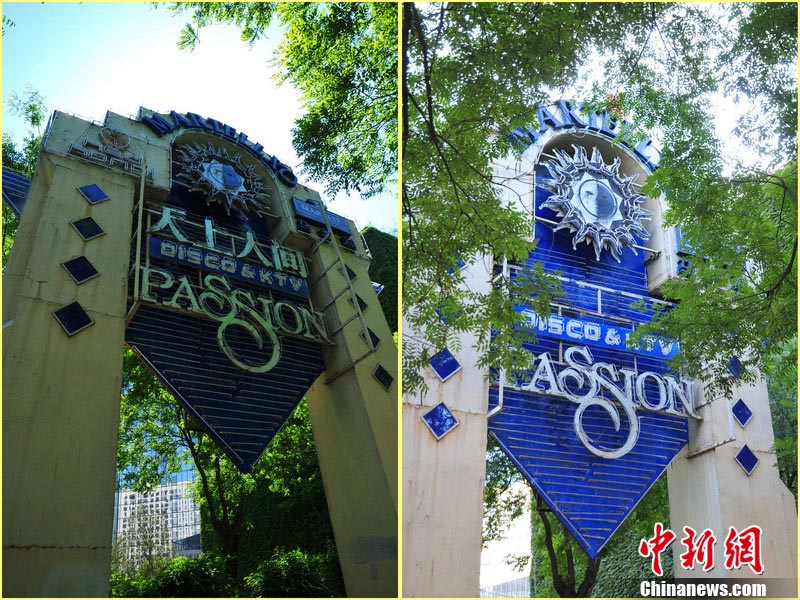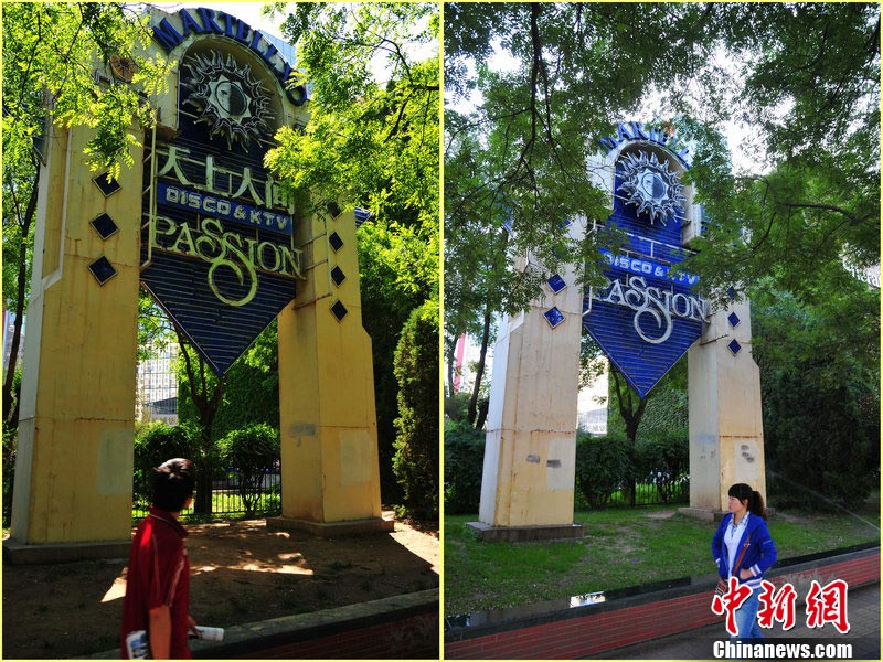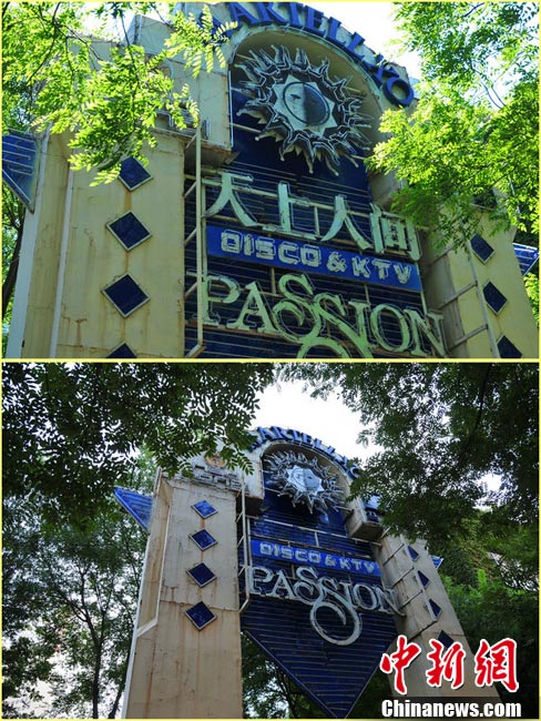 10月5日,北京东三环北路,蜚声全国的京城第一夜总会——“天上人间”夜总会的招牌已经摘下。此前,因涉嫌有偿陪侍,“天上人间”夜总会被勒令停业整顿。图为摘牌前后的“天上人间”夜总会。 图片来源:CFP视觉中国