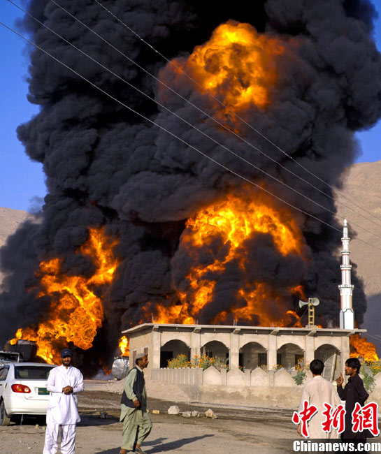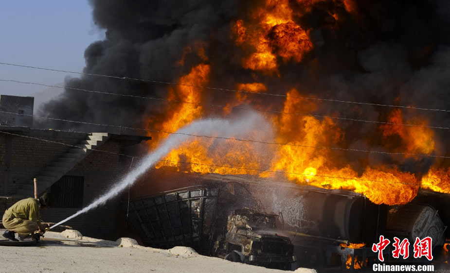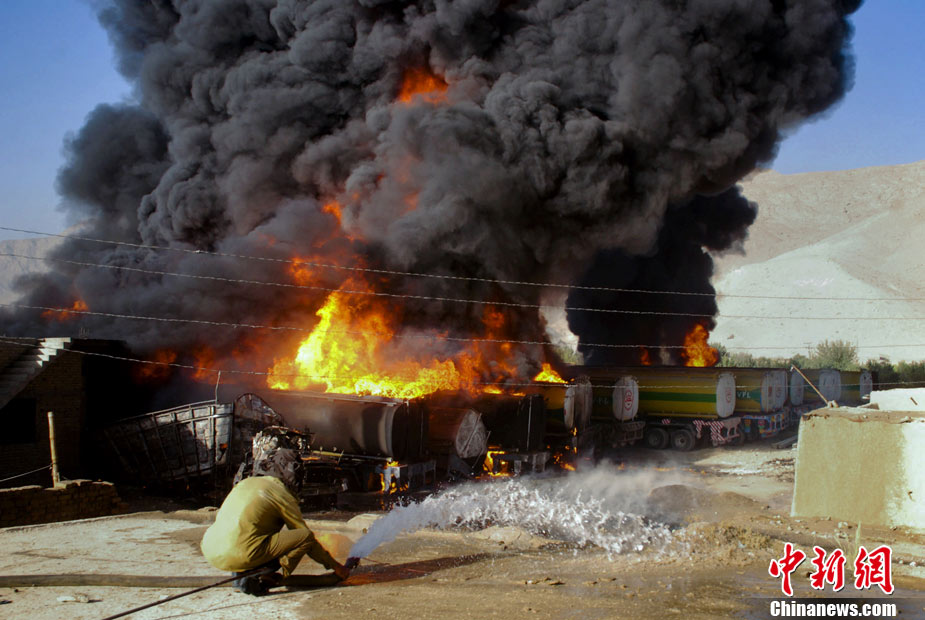10月6日早晨,20多辆北约油罐车在巴基斯坦西部城市奎达附近被一伙身份不明的武装分子烧毁,警方称可能有人员伤亡。据报道称,火势非常猛烈,从距离很远的地方都能看到。消防队员正在实施紧急灭火作业。