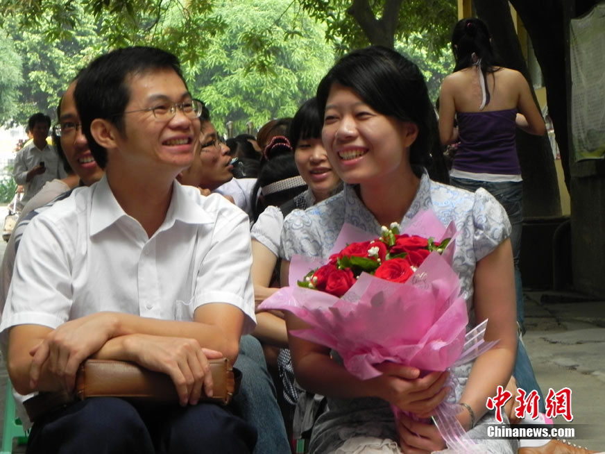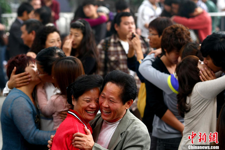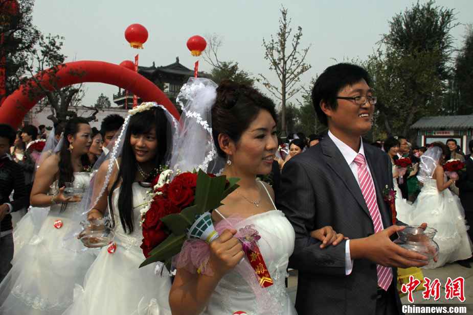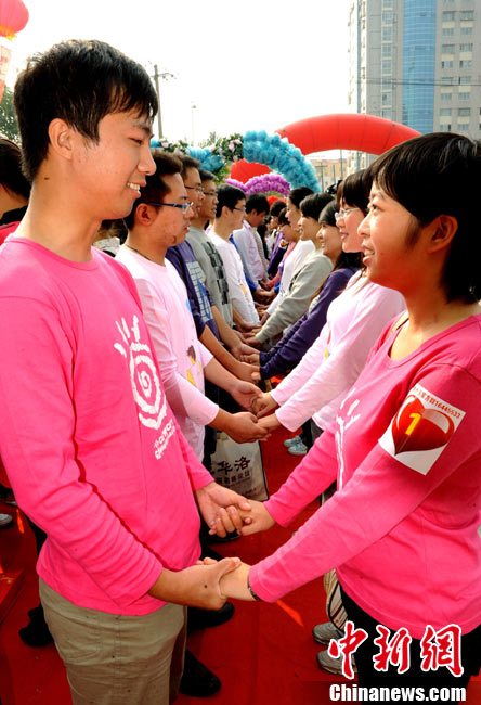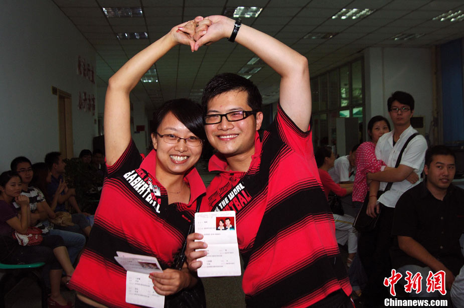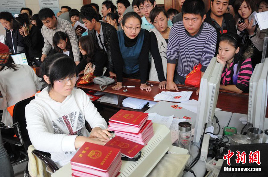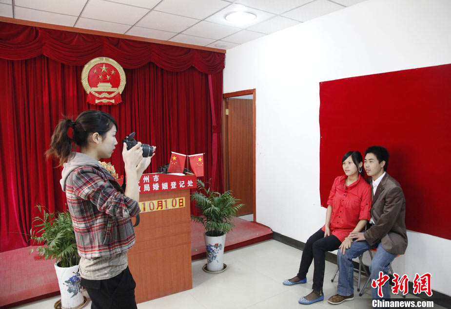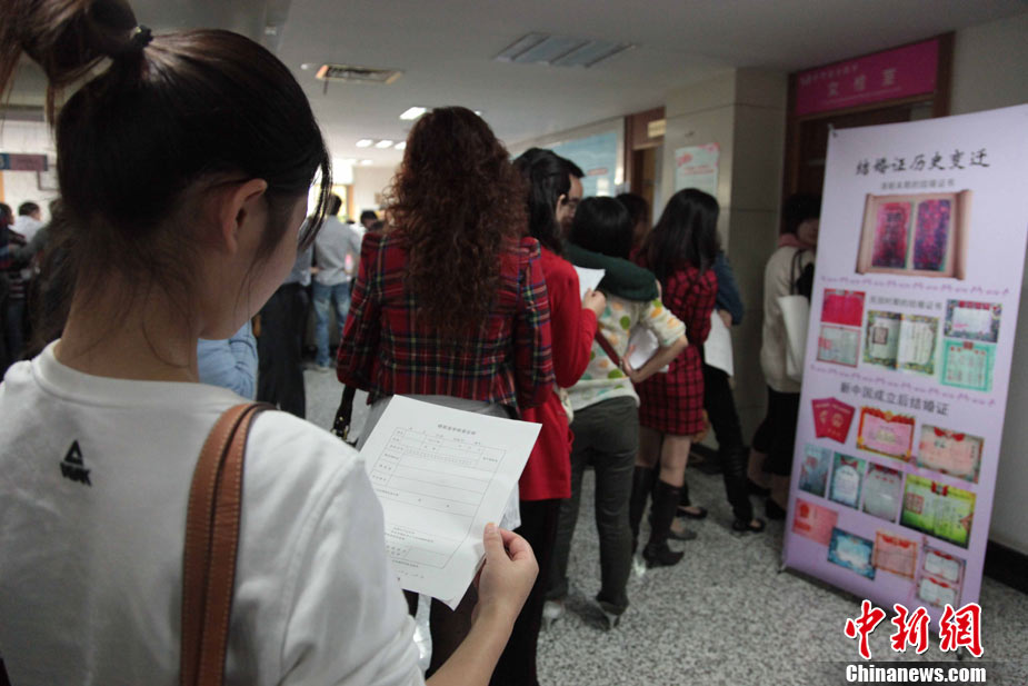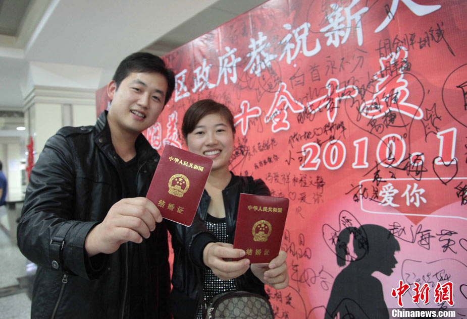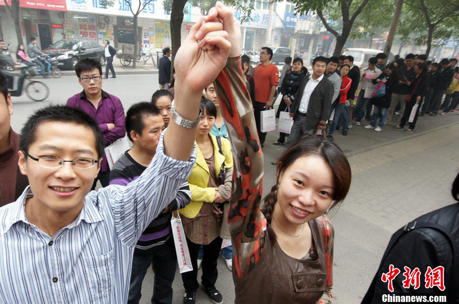 2010年10月10日,全国各地新人办理结婚登记。很多新人选择被寓意“十全十美”的好日子领结婚证。图为郑州出现结婚登记高峰,导致各区民政局婚姻登记处门前都排起长长的队伍。一对新人在长长的队伍中手挽手排除等候。沙浪 摄 图片来源:CFP视觉中国