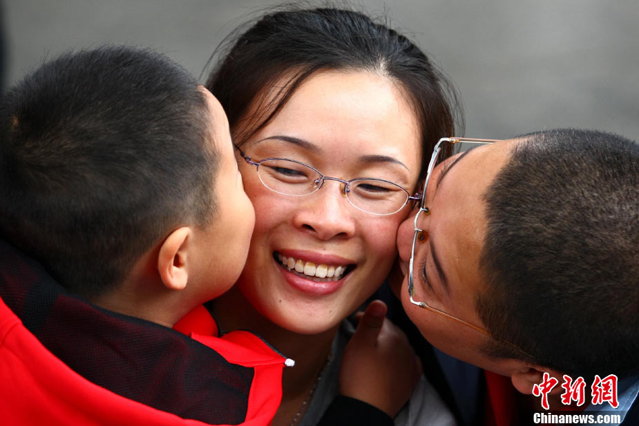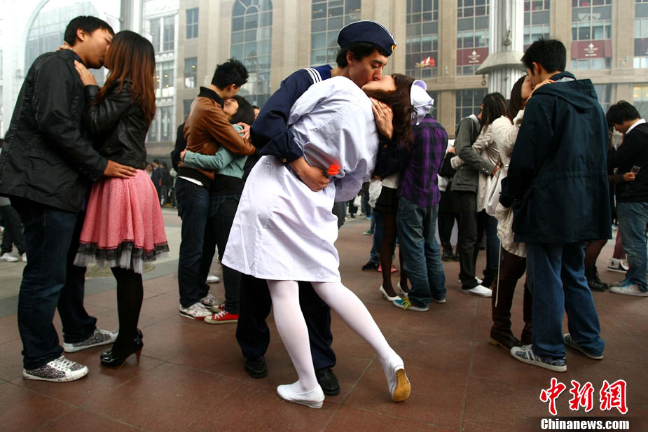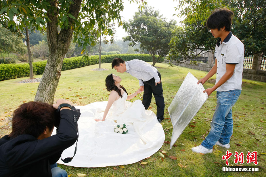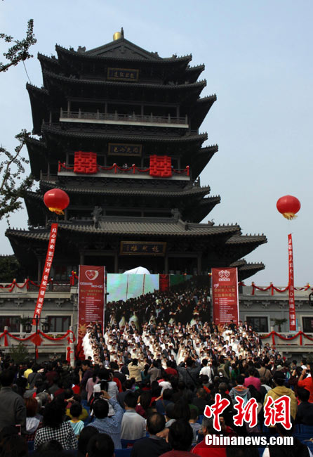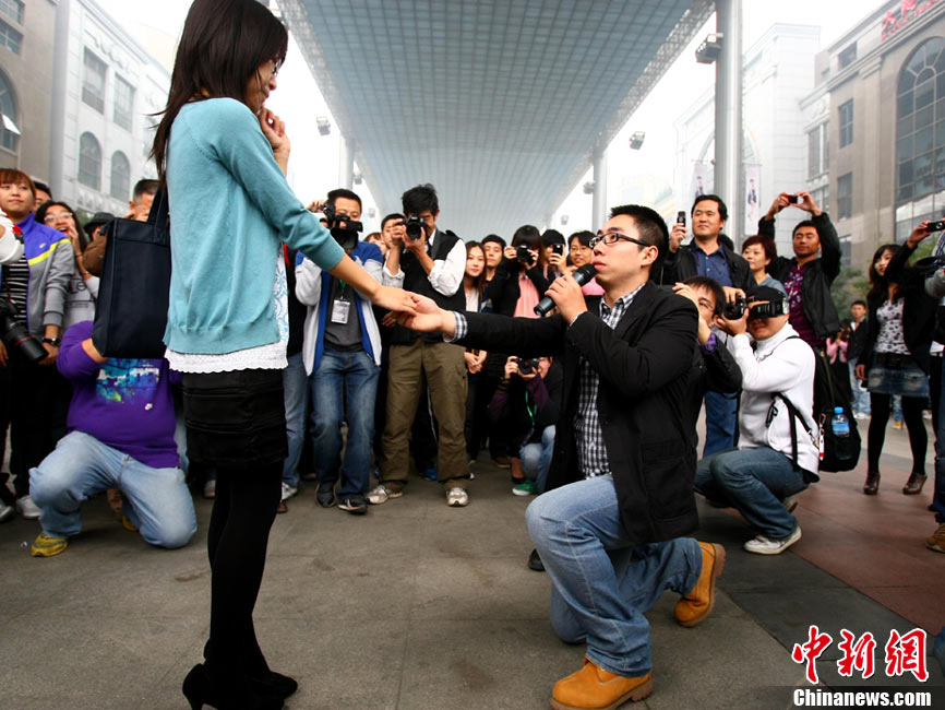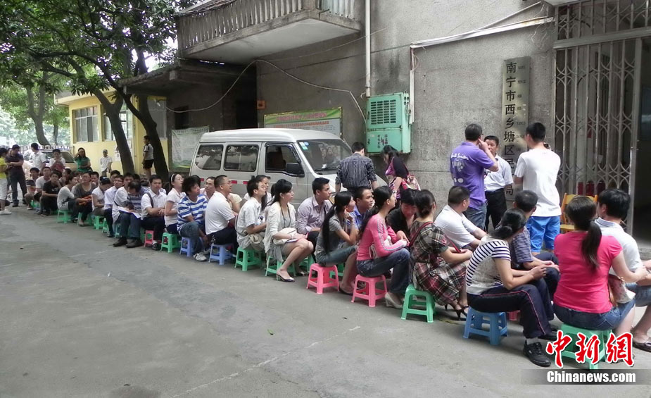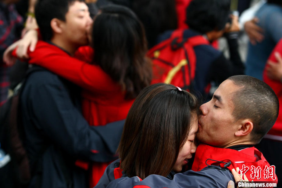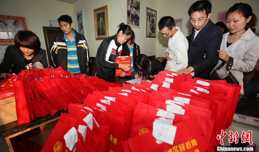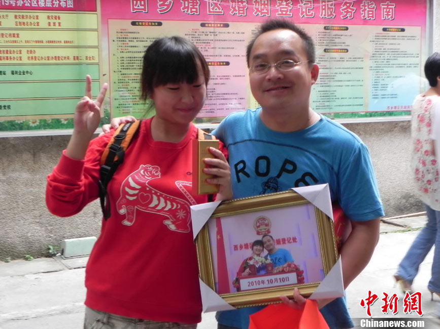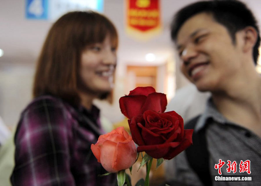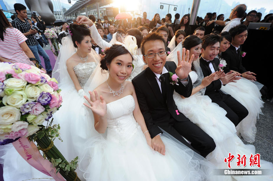 2010年10月10日,全国各地新人办理结婚登记。很多新人选择被寓意“十全十美”的好日子领结婚证。图为郑州出现结婚登记高峰,导致各区民政局婚姻登记处门前都排起长长的队伍。一对新人在长长的队伍中手挽手排除等候。沙浪 摄 图片来源:CFP视觉中国