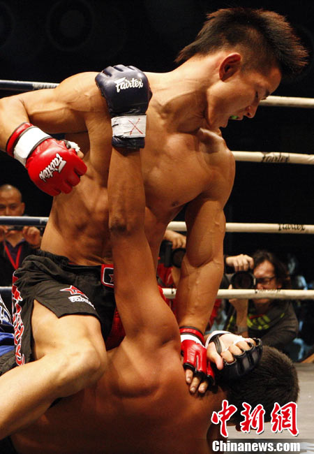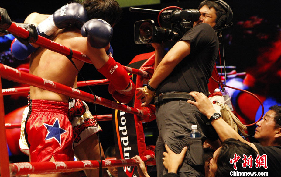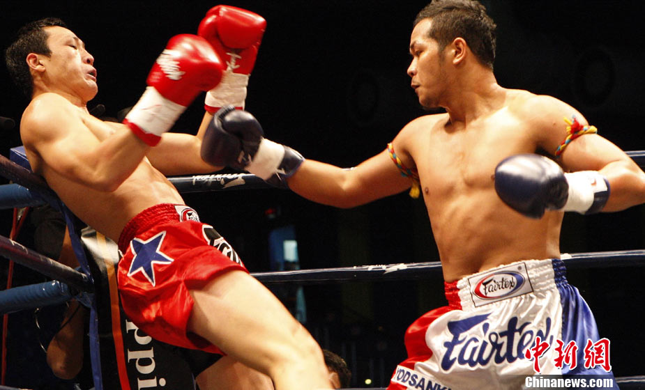 10月9日晚,由马来西亚IPC国际集团和中国国际文化传播中心以及英雄传说赛事机构联手主办的“英雄传说-决战云顶”世界搏击王者争霸赛暨中泰拳王争霸战在马来西亚吉隆坡云顶举行。图为泰国拳王雅桑克莱与中国王冠对决。 中新社记者 钱兴强 摄