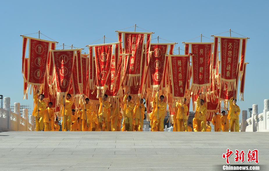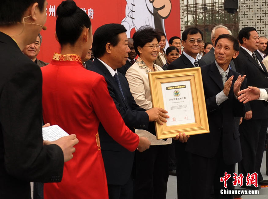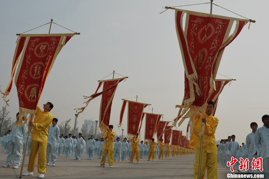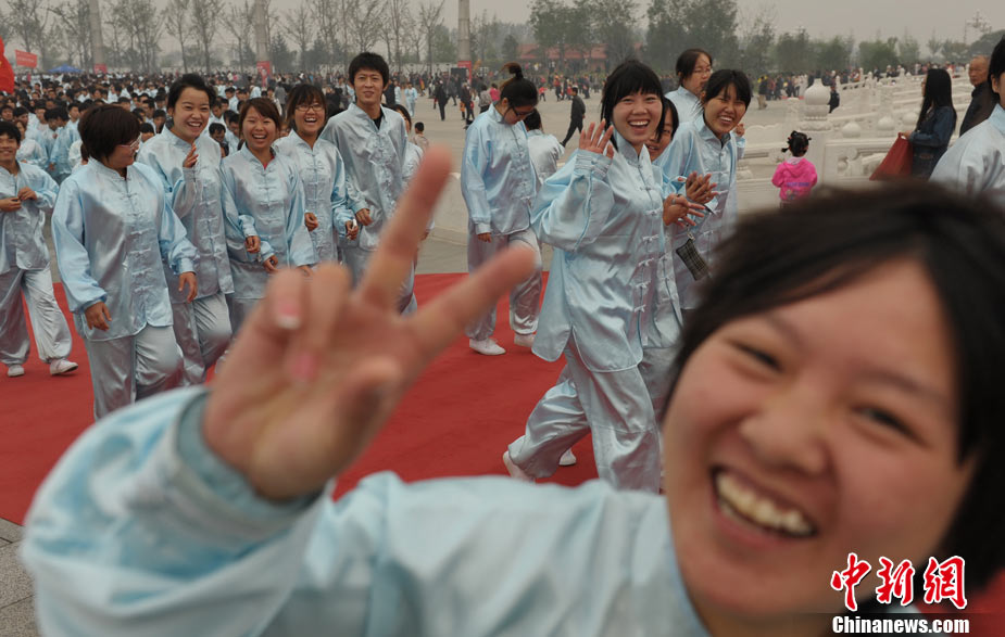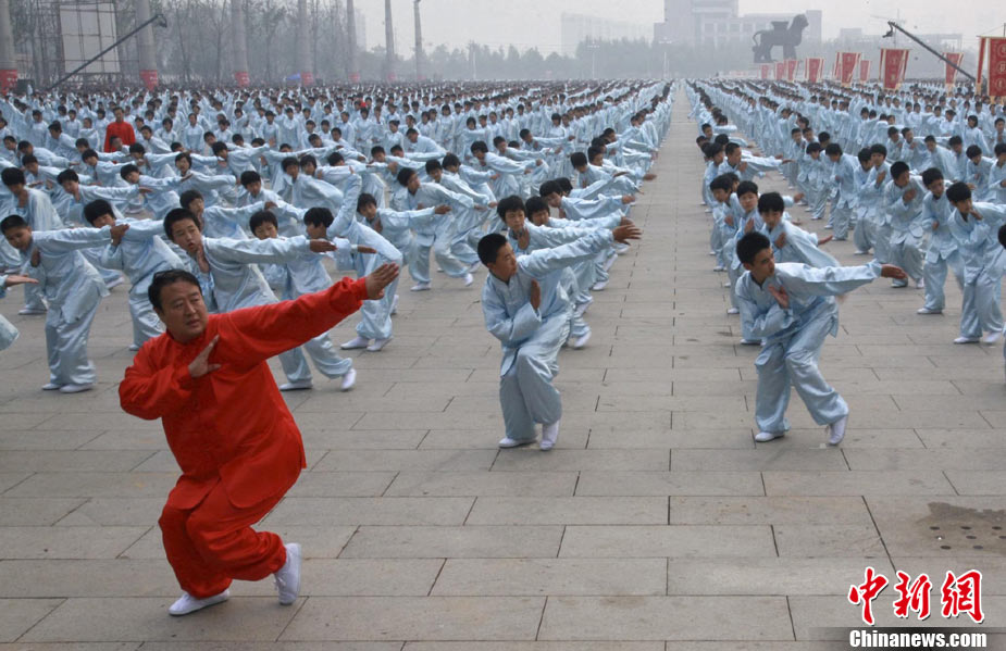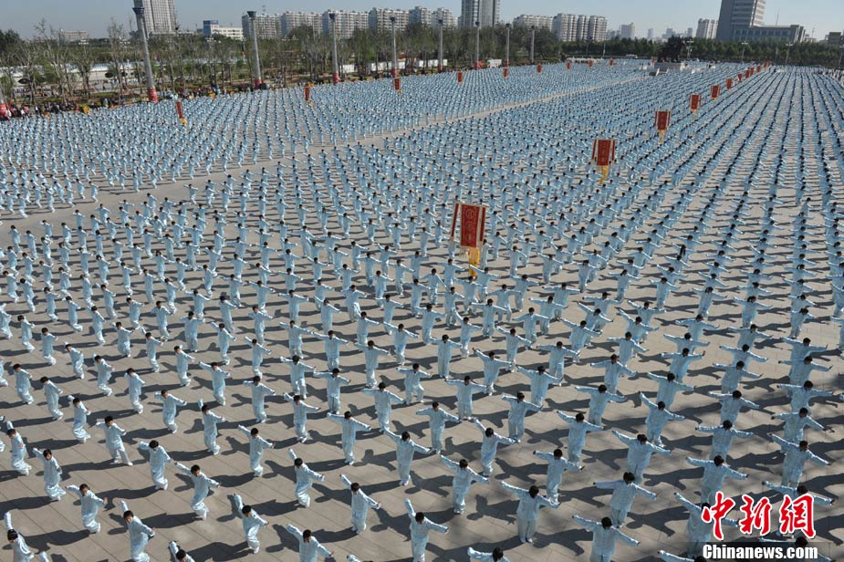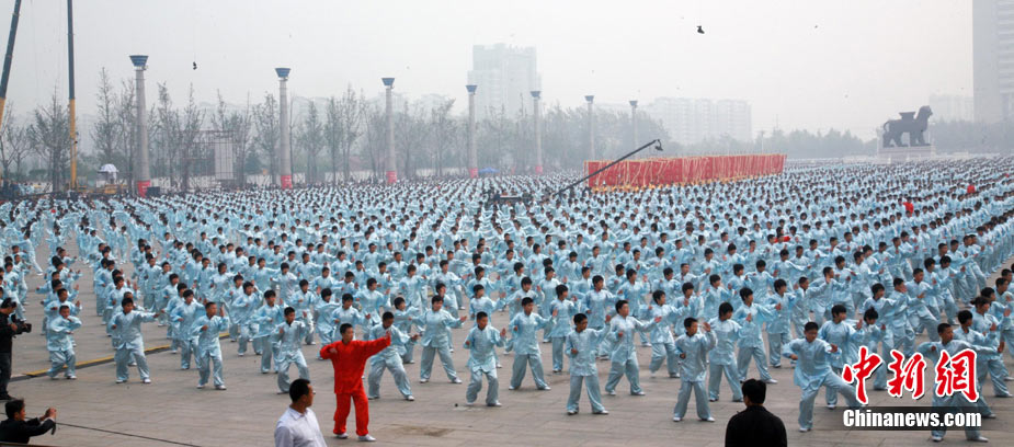 10月10日,中国“武术之乡”沧州狮城公园广场“拳涛”滚滚、武健泱泱,1.5万人同习53个拳种,创造了《中国武术拳种同时展演数量之最》吉尼斯纪录,上海大世界吉尼斯总部现场认证。图为万人习武现场。王少华 张书俭 摄