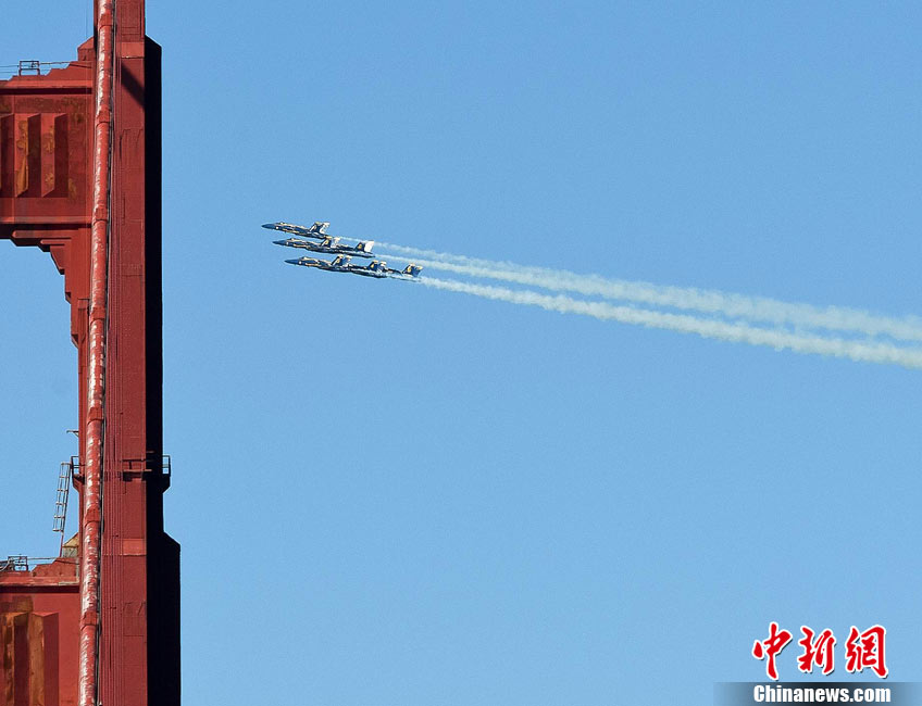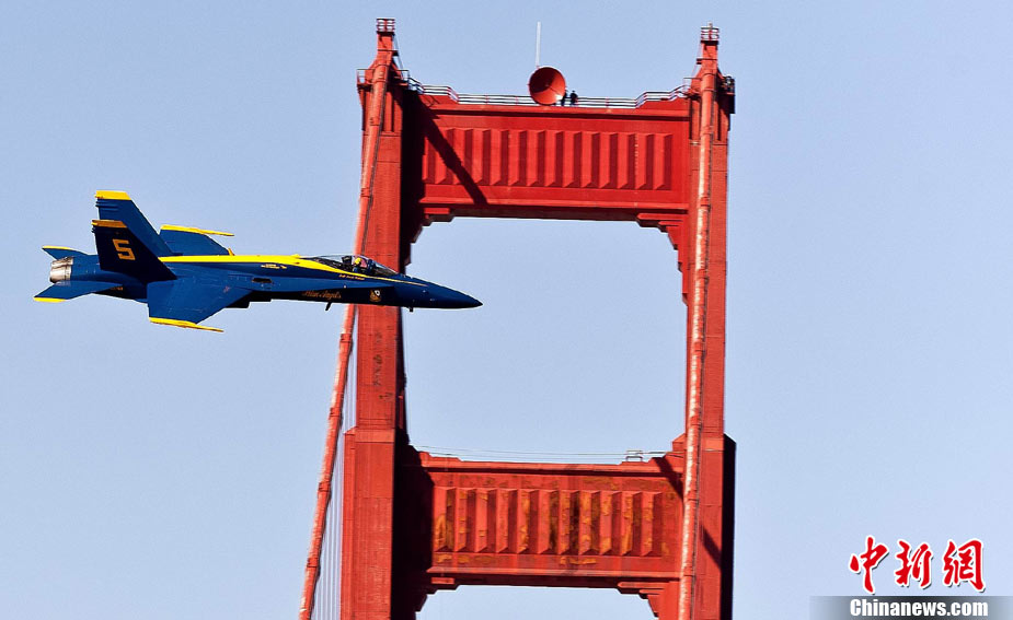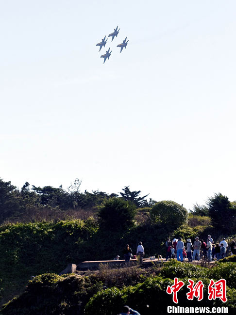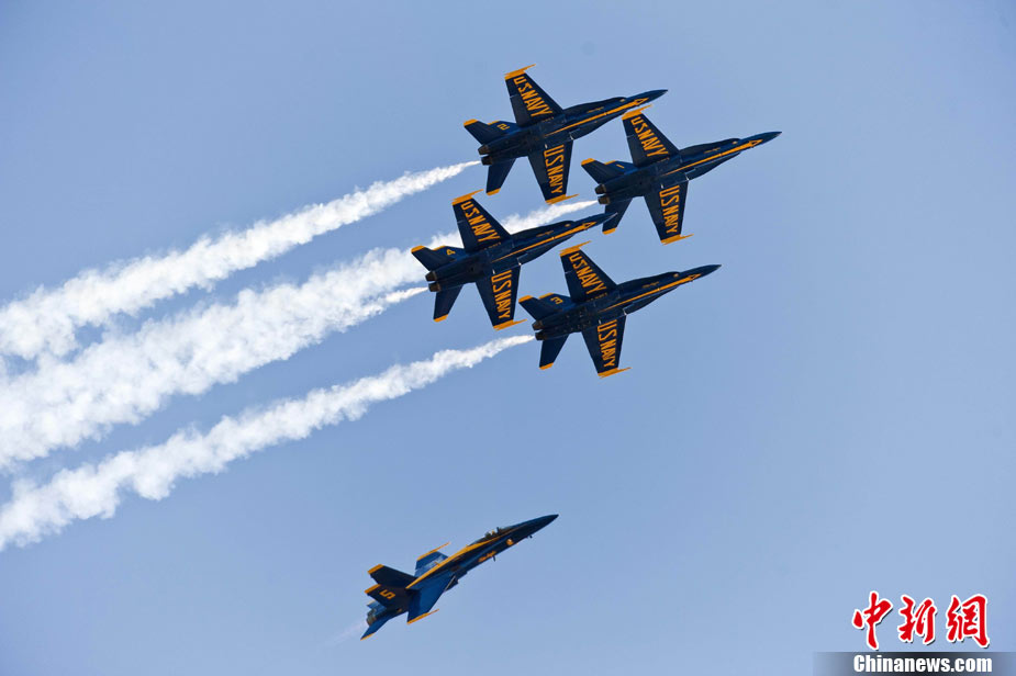 当地时间10月9日下午,美国海军蓝天使飞行表演队在旧金山举行一年一度的“舰队周”活动。图为5架F-18战斗机编队表演。 中新社发 陈钢 摄