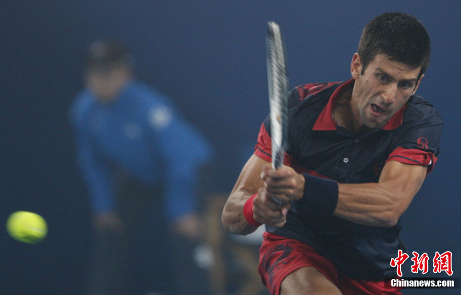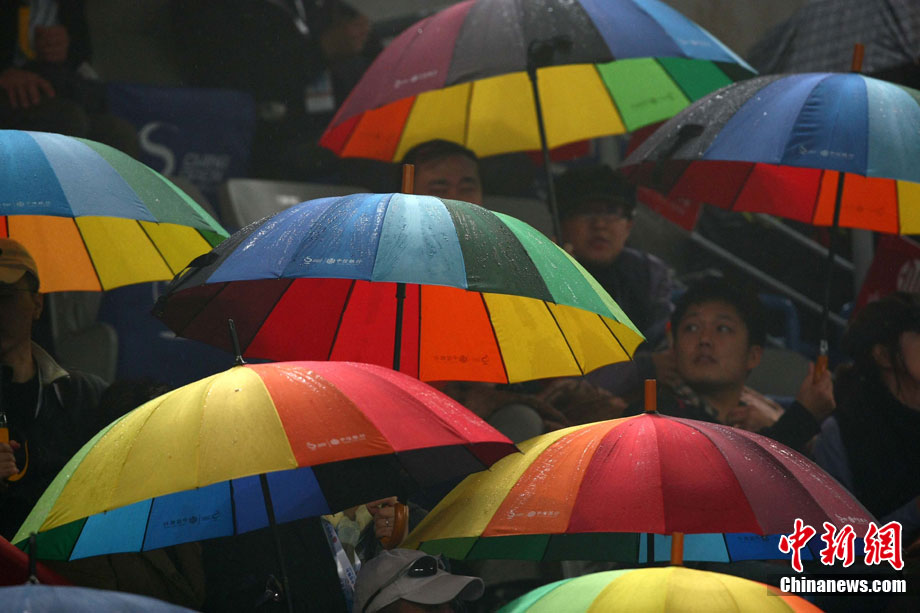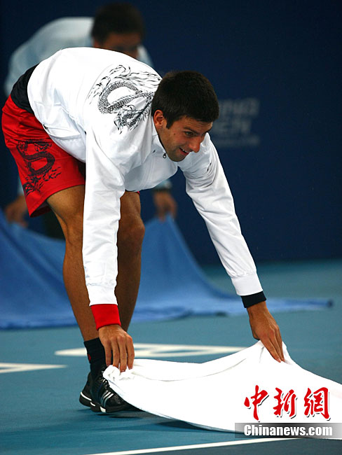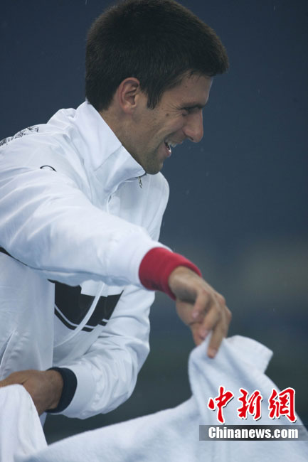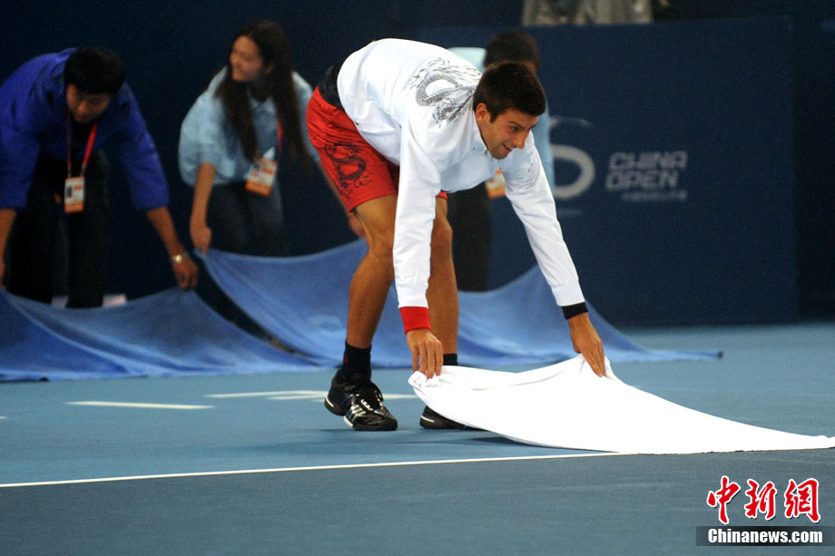 10月10日,总奖金额为210万美元的ATP'500中网公开赛进入最后一天的争夺,卫冕冠军德约科维奇与西班牙名将费雷尔之间的男单决赛因雨中断,比赛暂停时小德以3-1的比分暂时领先。中新社记者 富田 摄