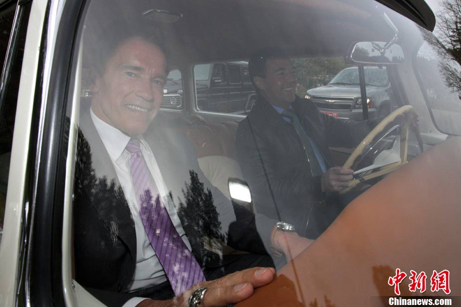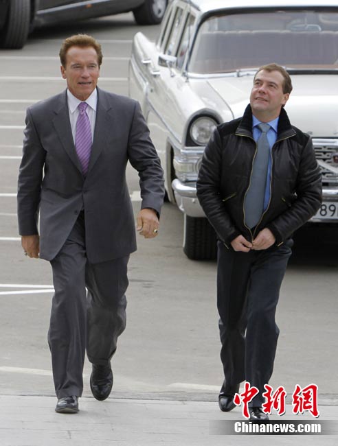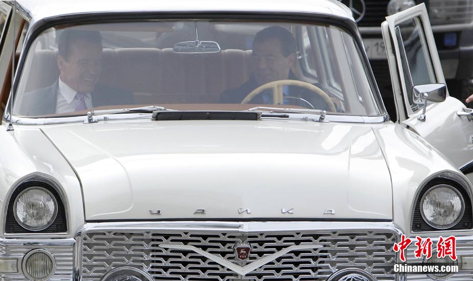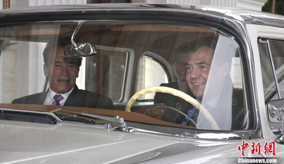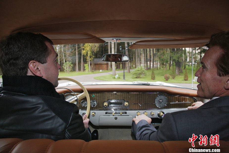 10月11日,莫斯科,美国加州州长施瓦辛格访问俄罗斯,与俄罗斯总统梅德韦杰夫会面。梅德韦杰夫总统还为施瓦辛格客串了一把“司机。”