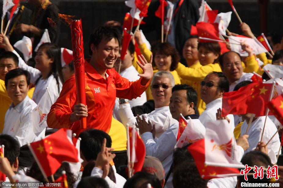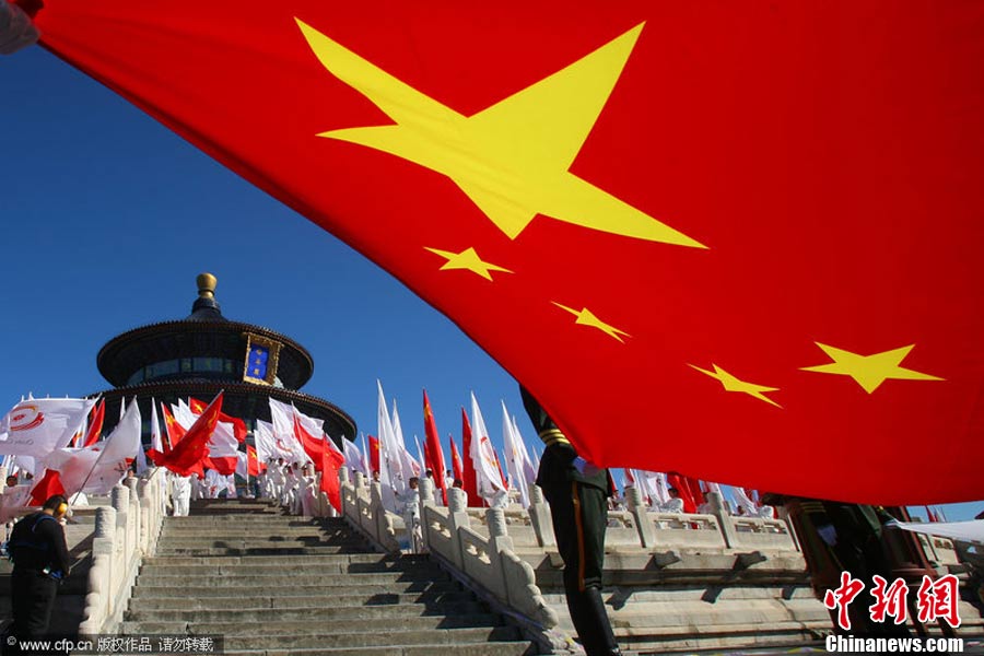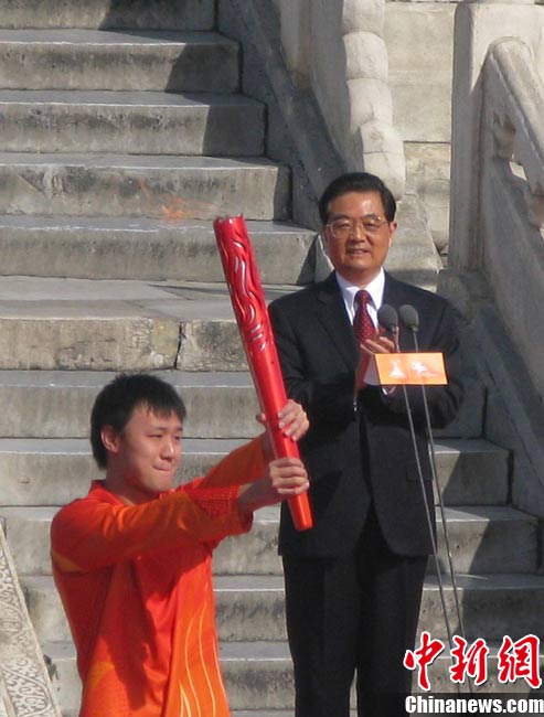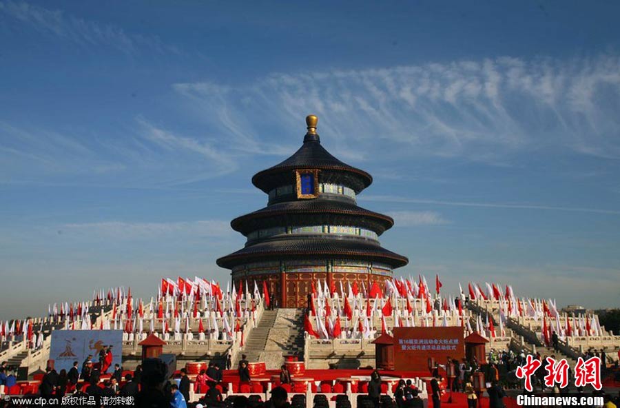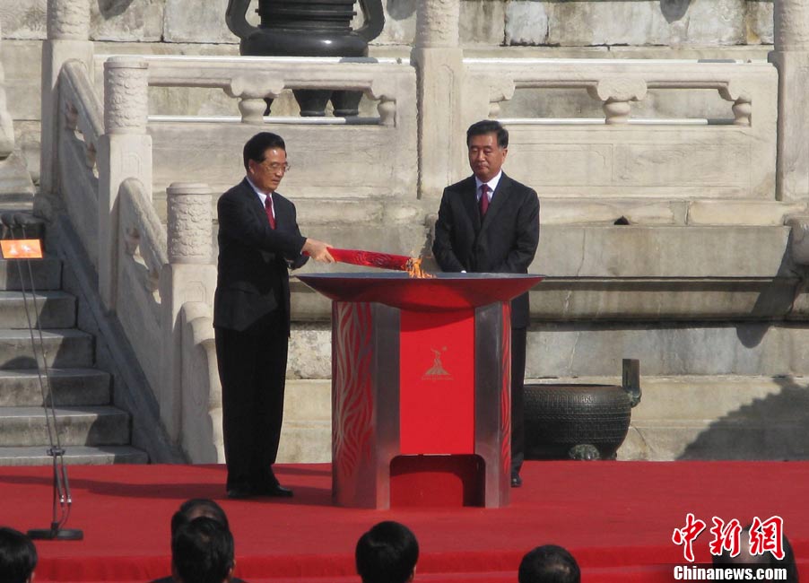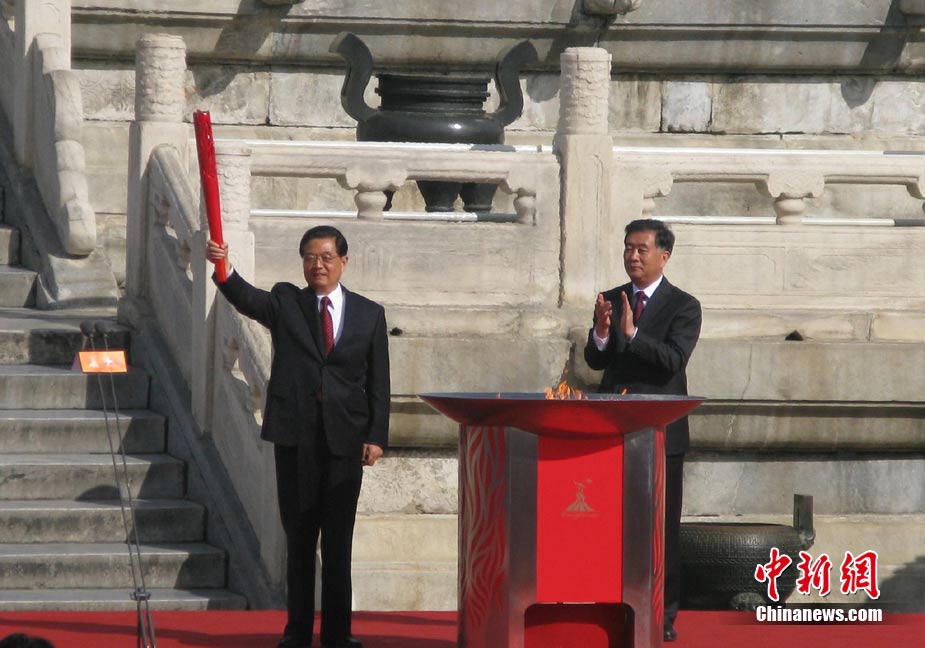 10月12日上午,广州亚运会火炬点燃暨传递启动仪式在北京天坛祈年殿南广场举行。10点17分,中共中央总书记、国家主席胡锦涛点燃主火炬。 中新社记者 沈晨 摄