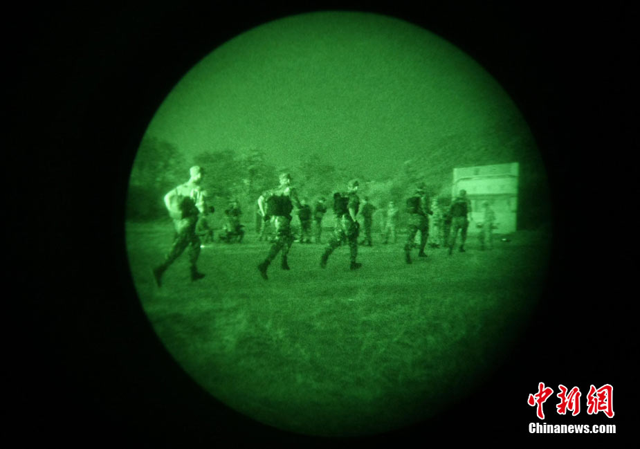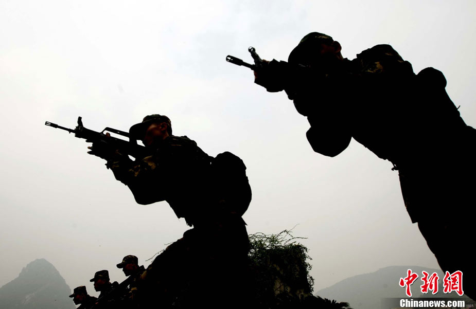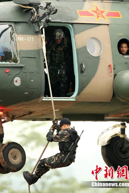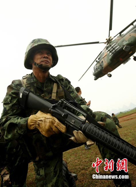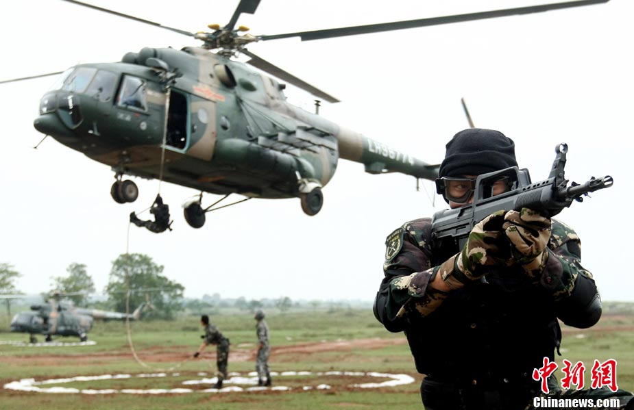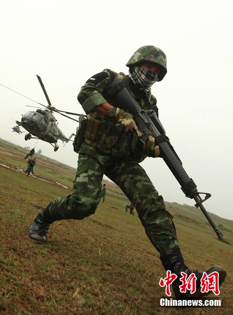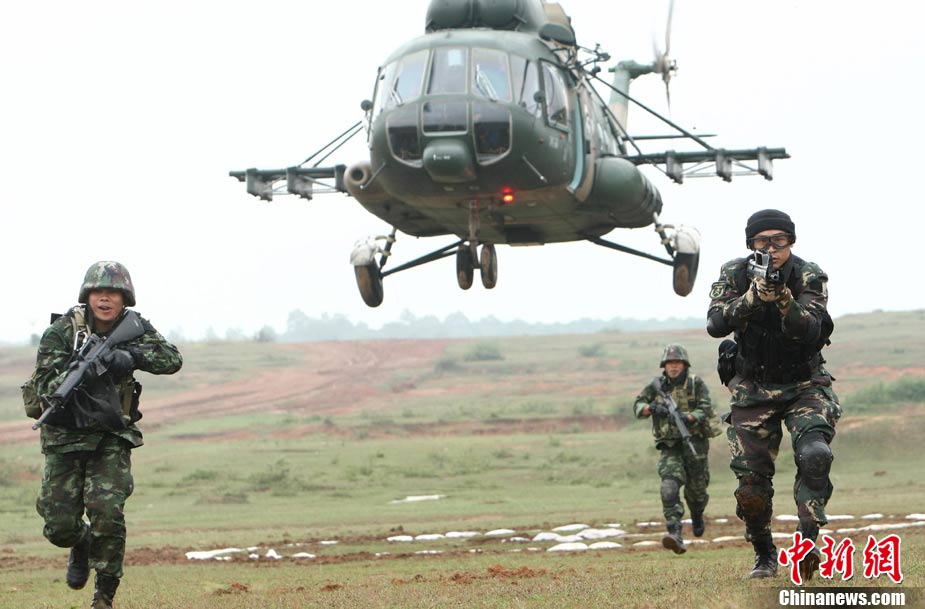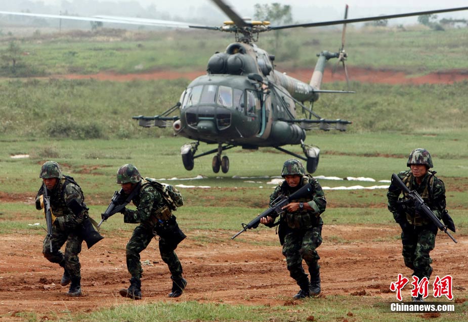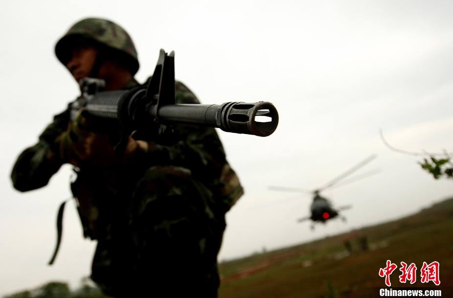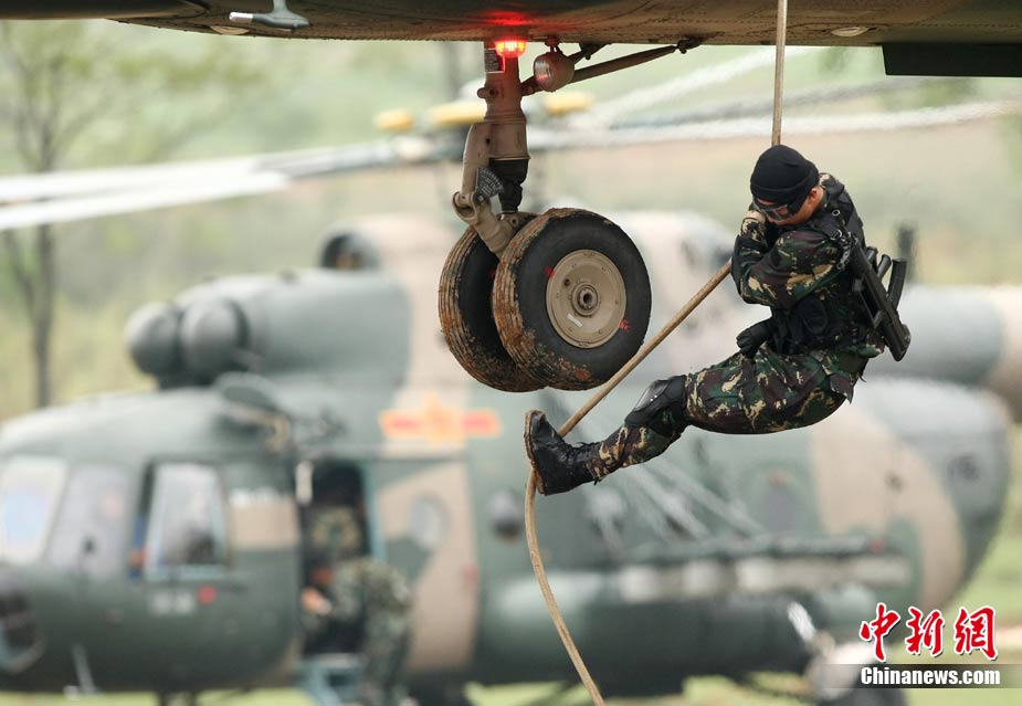 10月12日,在广西桂林进行的中泰陆军特种部队反恐联合训练开展混合编组机降突袭演练。中新社发 杜洋 摄