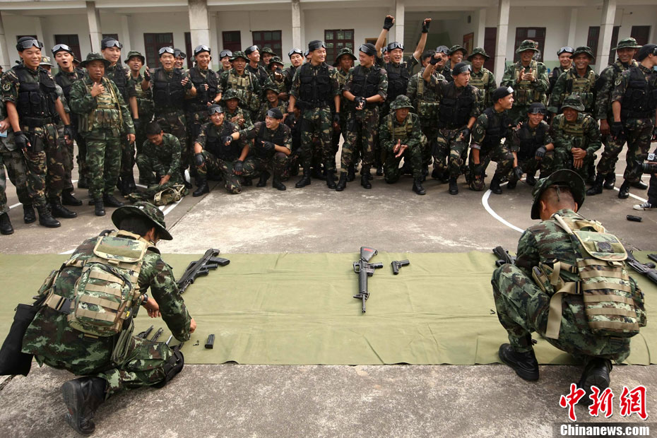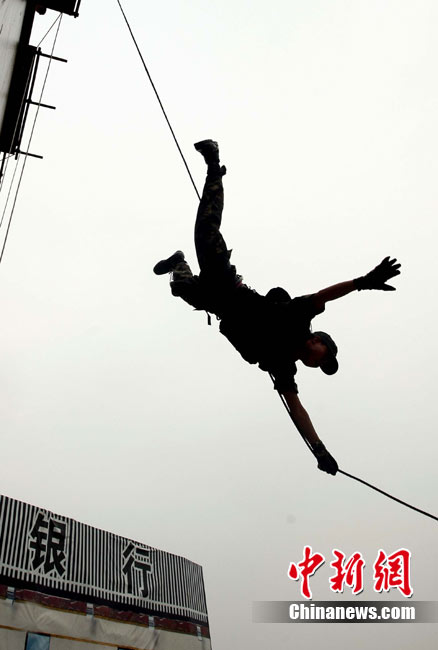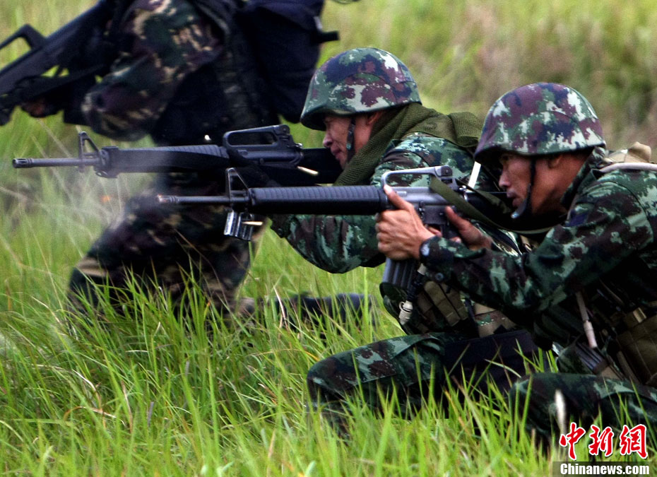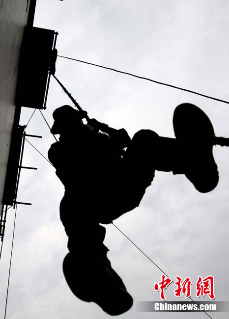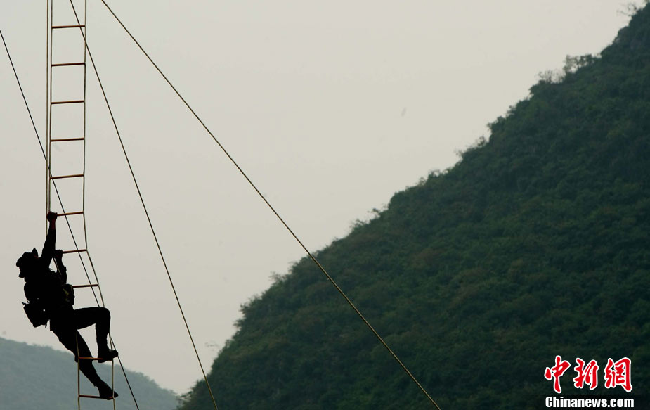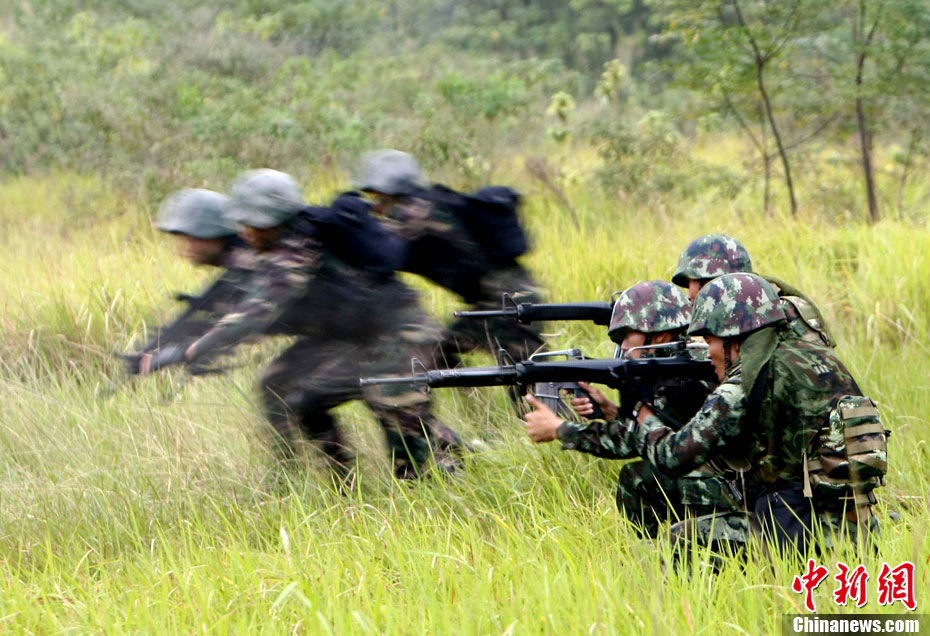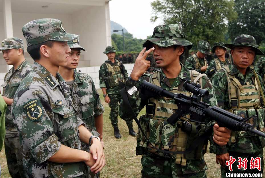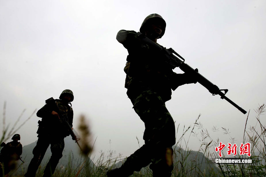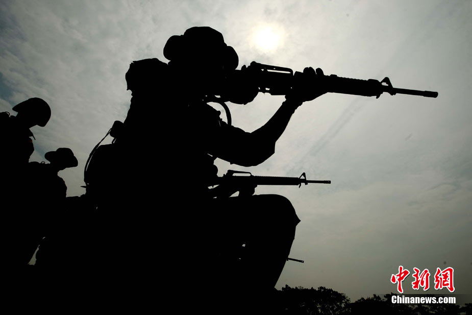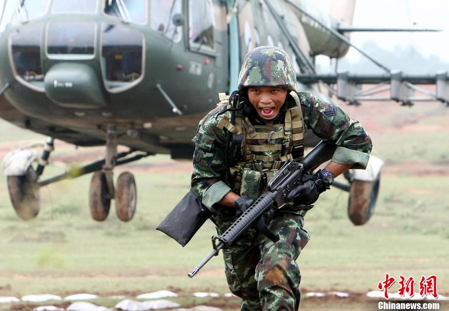 10月12日,在广西桂林进行的中泰陆军特种部队反恐联合训练开展混合编组机降突袭演练。中新社发 杜洋 摄