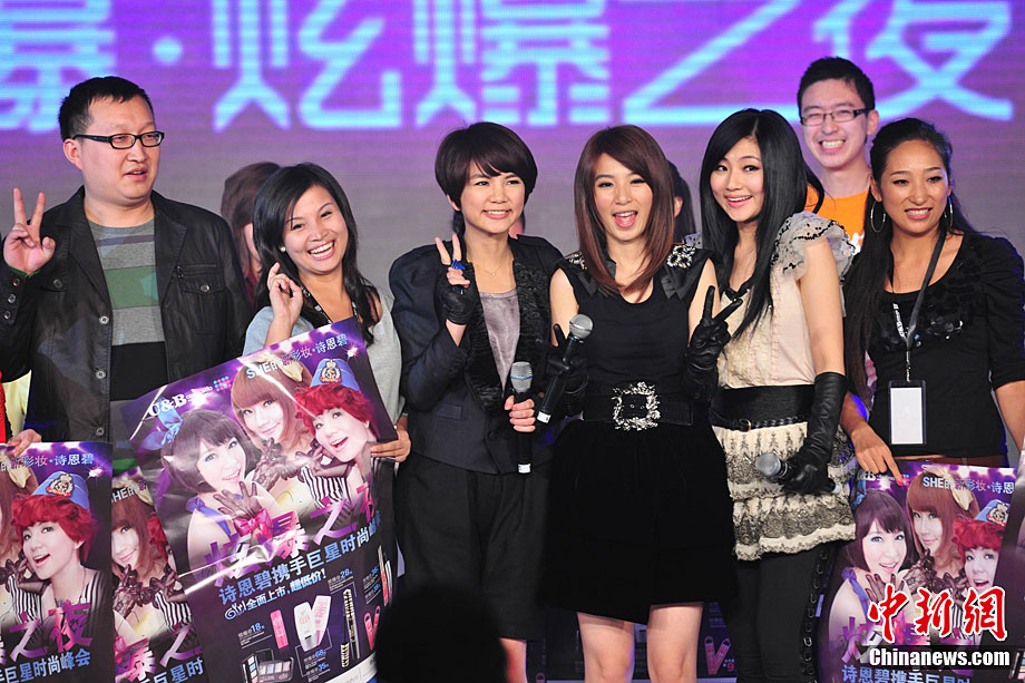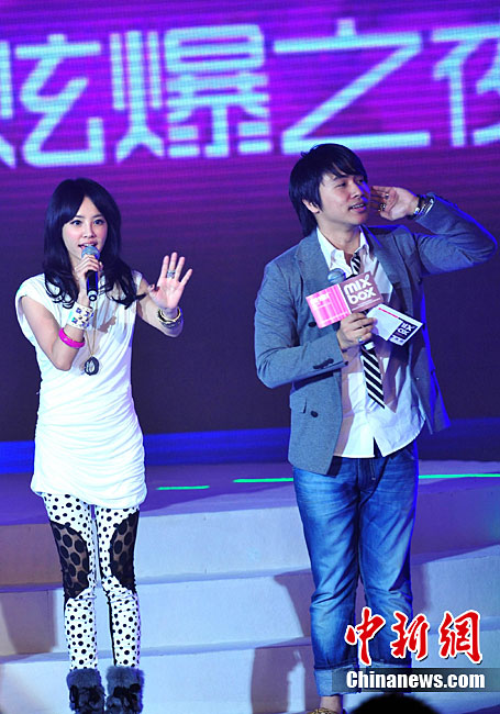 10月12日,美爆·炫爆之夜巨星时尚盛典在北京举行。华语乐坛天后级明星蔡依林、SHE、BY2闪亮出席。蔡依林现场当起舞蹈老师教舞,主持人欧弟身手笨拙搞笑摔倒。中新社记者 李学仕 摄