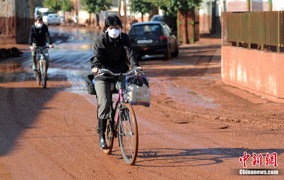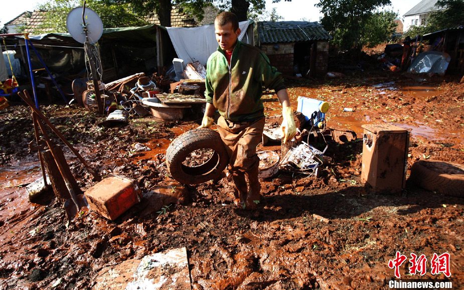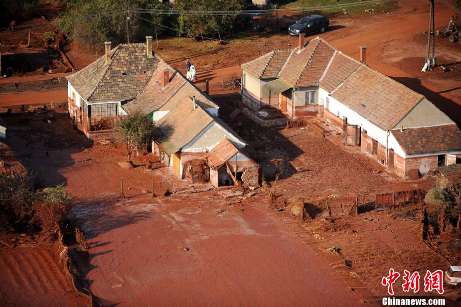 10月12日,匈牙利有毒废料已扩散到河道两岸以及居民区。截至目前,基于 “二次泄漏”的威胁,污染最严重的科隆塔尔镇中已有近1000人被迫离开自己的家园。图为居民经过被污染的路面。