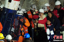 智利首名升井矿工弗洛伦西奥•阿瓦洛斯(Florencio Avalos)北京时间13日上午11点10分左右搭乘特制救生舱回到地面,成功获救。目前,救援工作成功迈出第一步,救生舱接下来将继续放入井下,营救其余32名被困矿工。图为阿瓦洛斯出井后与智利总统皮涅拉拥抱。