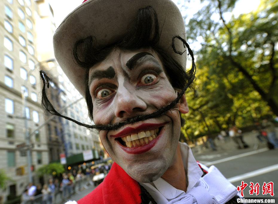来自意大利剧木偶奇遇记的剧成员在纽约曼哈顿第五大道进行街头表演。