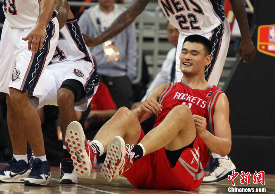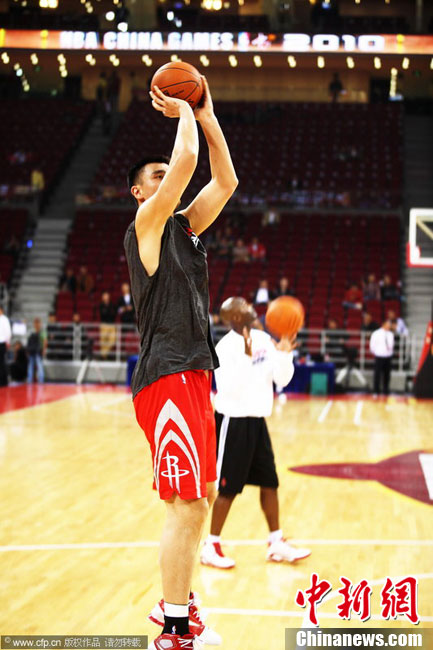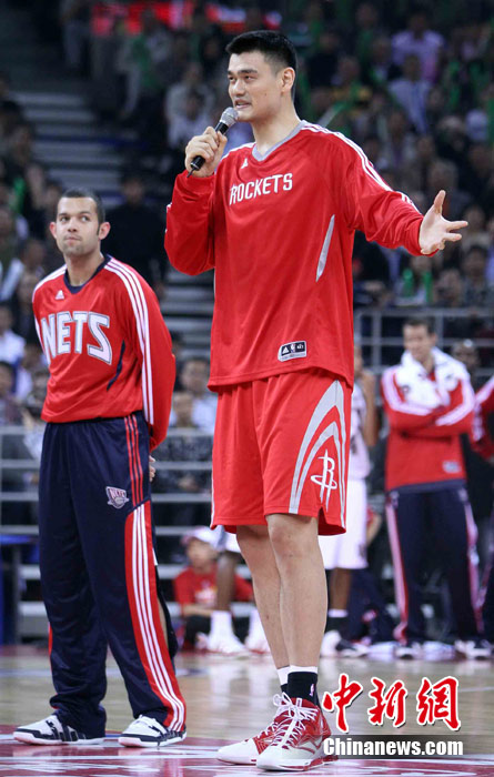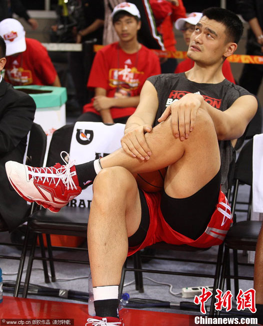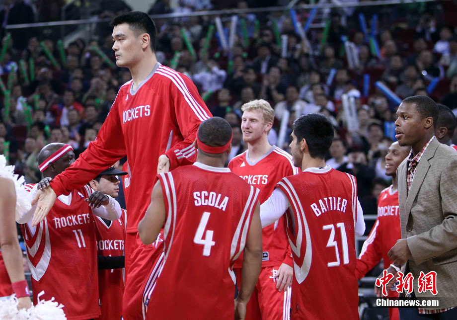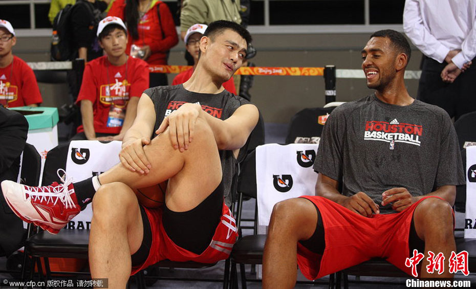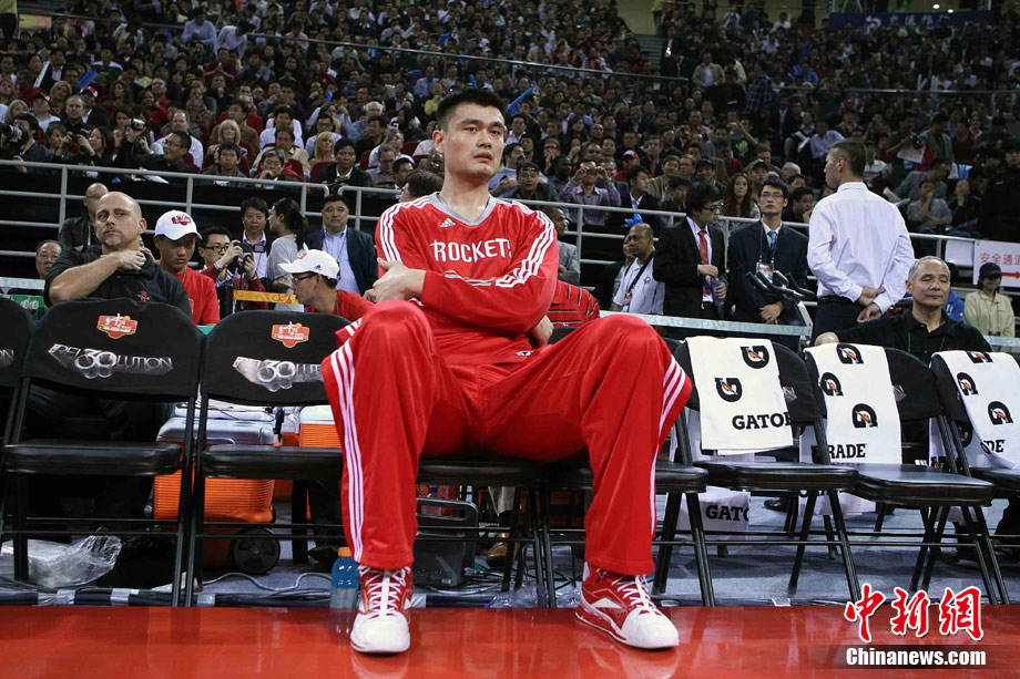10月13日,NBA中国赛第一场比赛在北京五棵松体育馆举行,休斯敦火箭队迎战新泽西网队。两支球队将于本月16日在广州进行第二场比赛。图为姚明热身后在场边休息。图片来源:CFP视觉中国