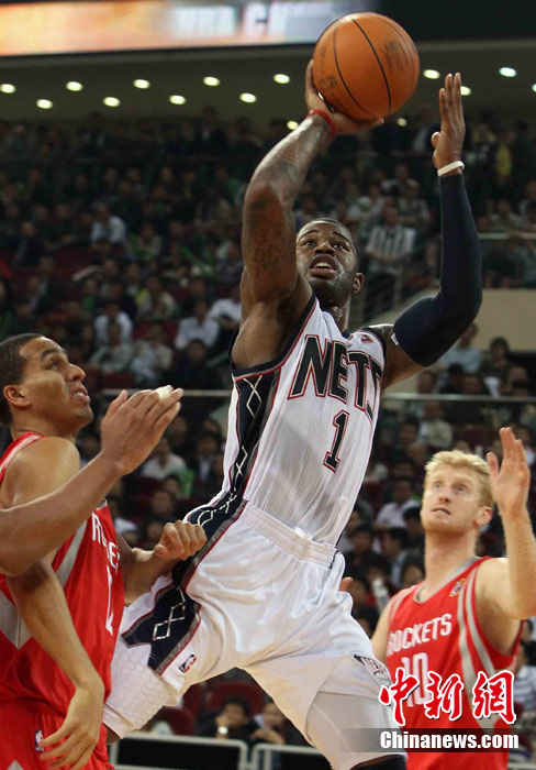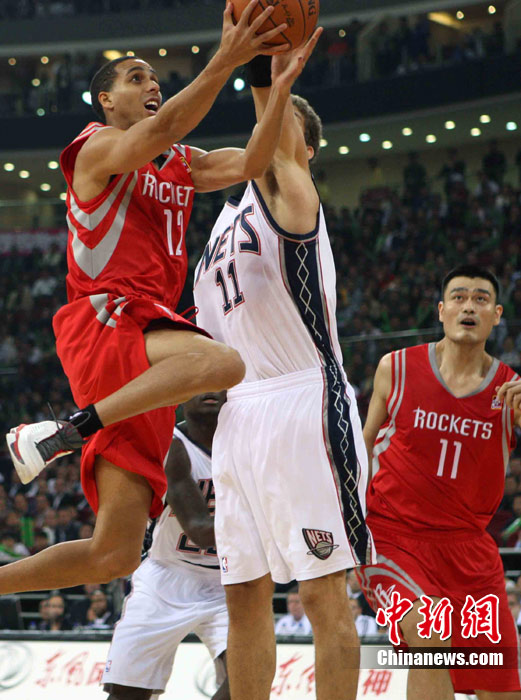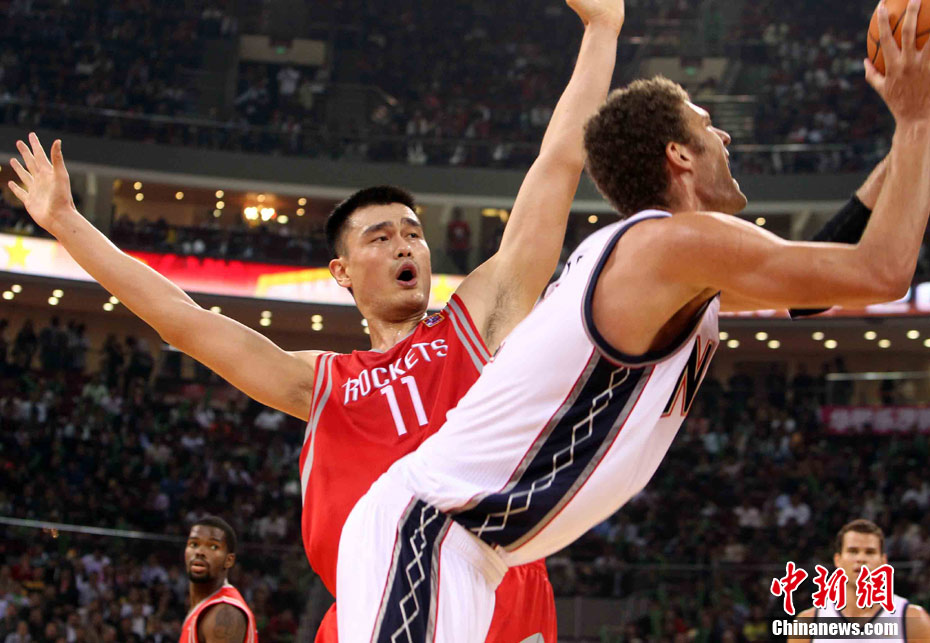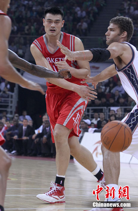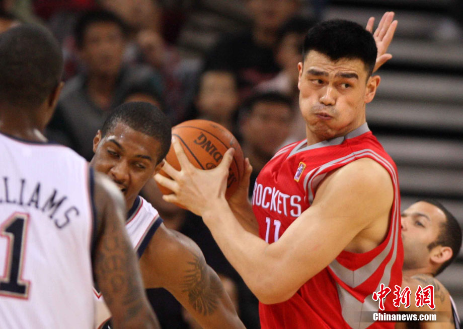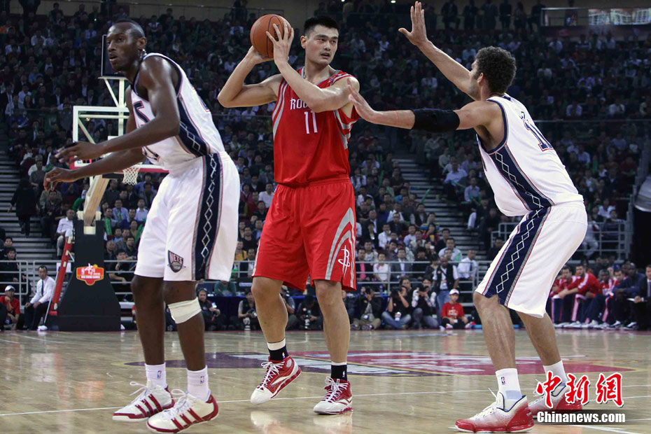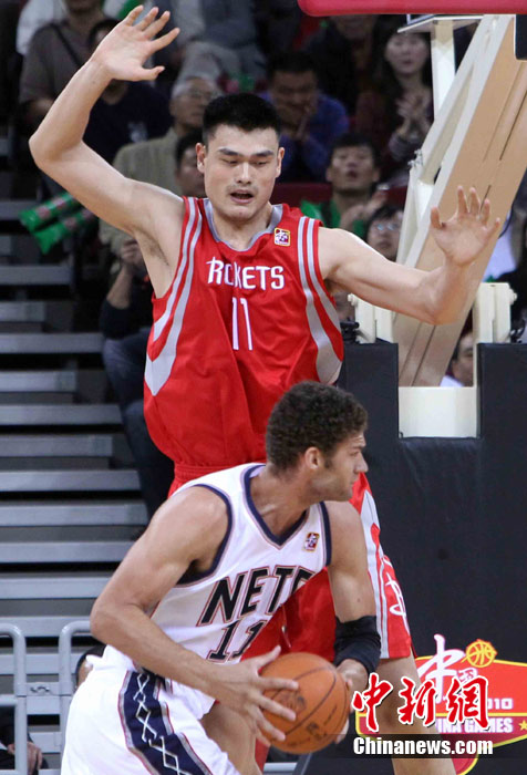 10月13日,NBA中国赛第一场比赛在北京五棵松体育馆举行,休斯敦火箭队迎战新泽西网队。两支球队将于本月16日在广州进行第二场比赛。图为姚明热身后在场边休息。图片来源:CFP视觉中国