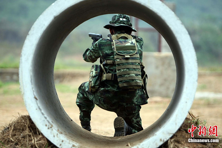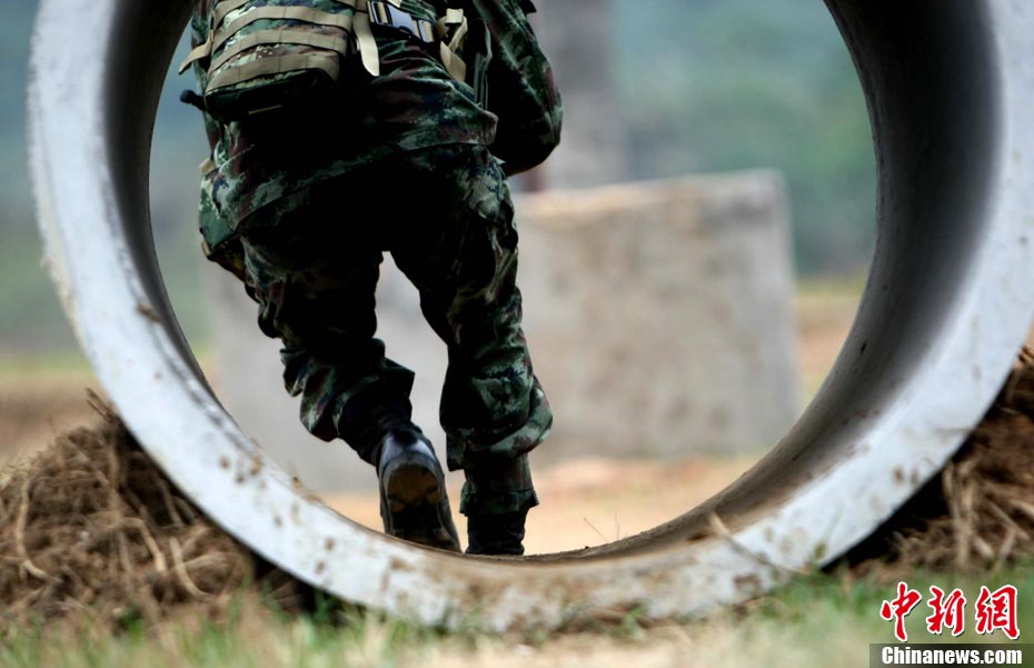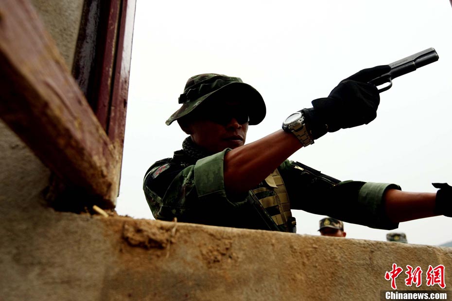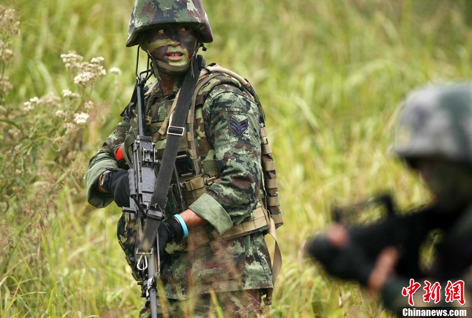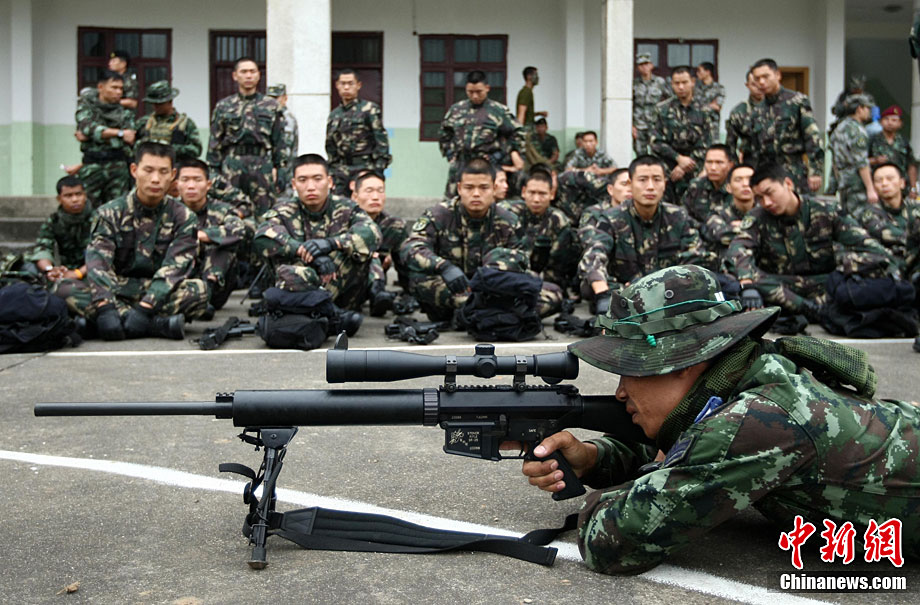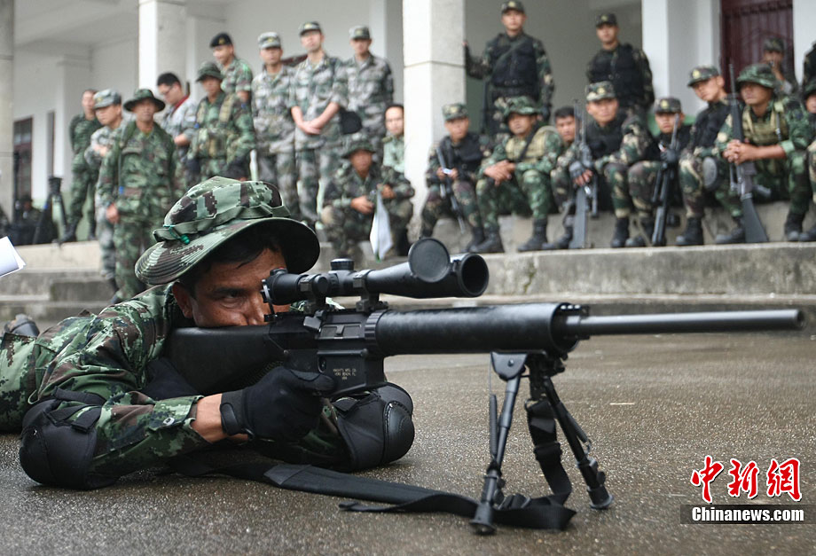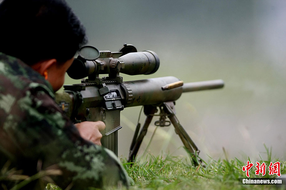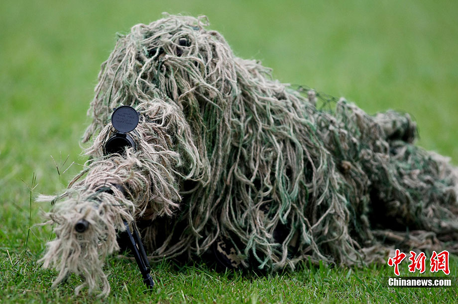 “突击-2010”中泰陆军特种部队反恐联合训练10月6日至20日在广西壮族自治区桂林进行。图为身着伪装服的狙击手。中新社记者 杜洋 摄