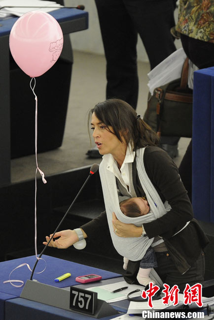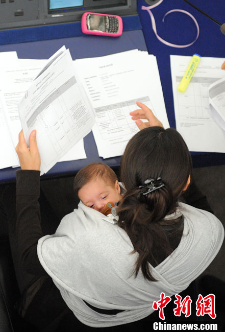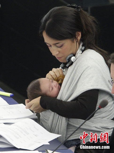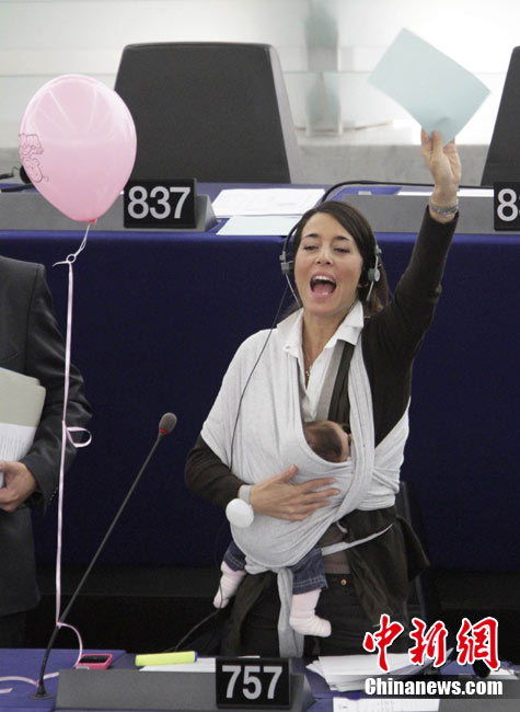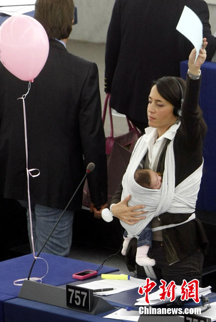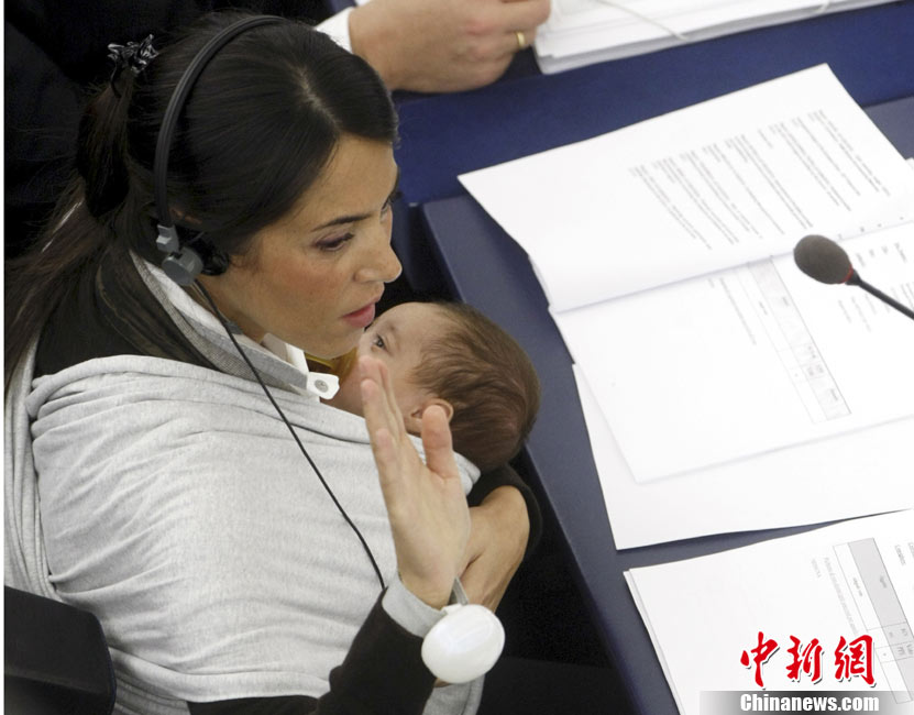 10月20日,欧洲议会在法国的斯特拉斯堡为延长产假的提案举行投票,代表丽希亚·隆苏依带着孩子出席会议。