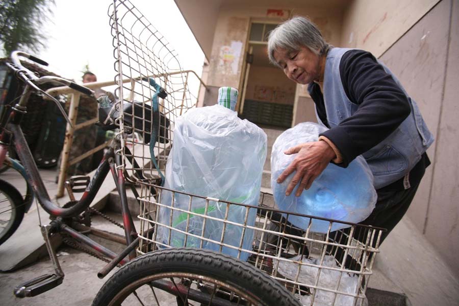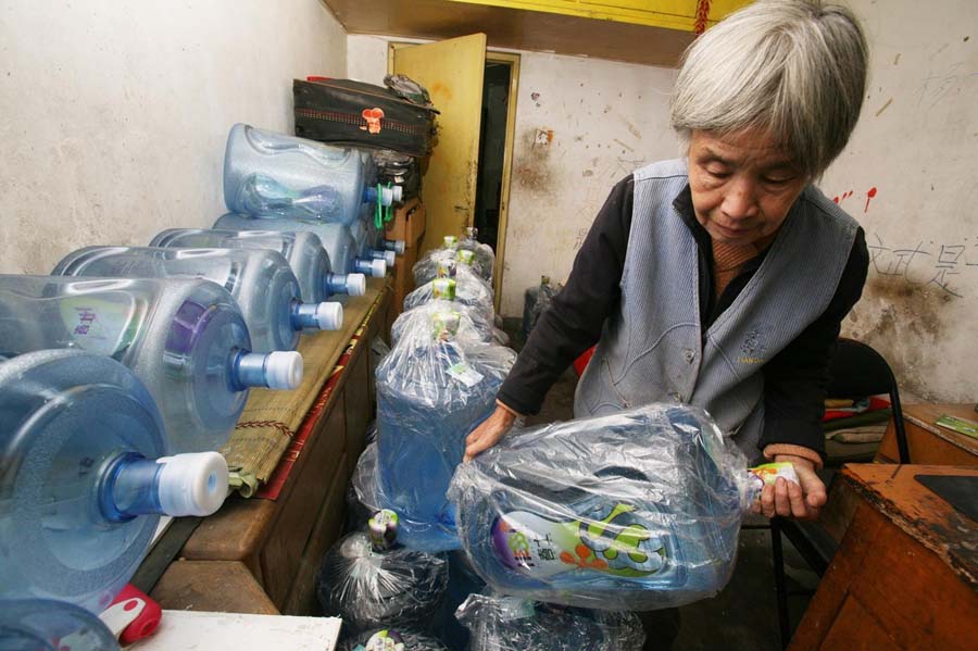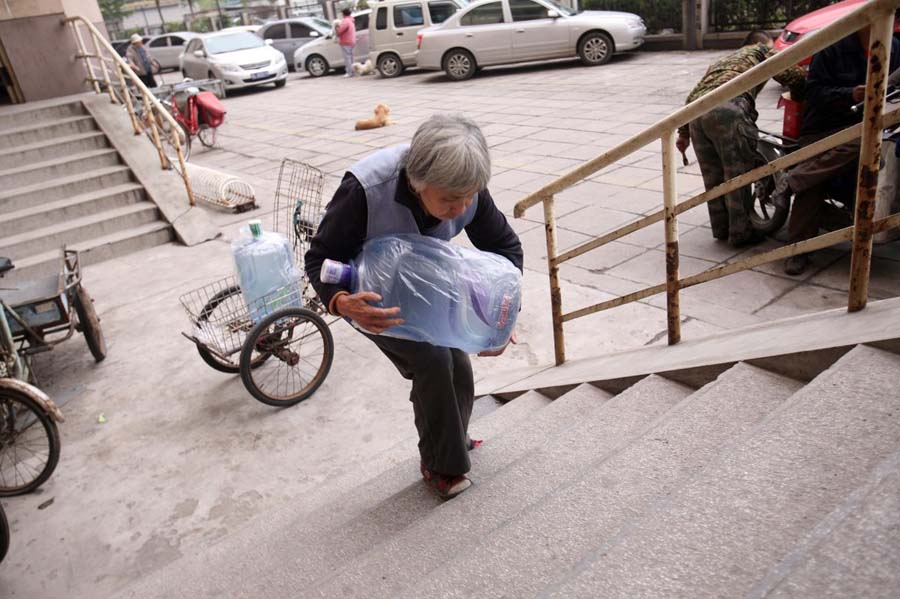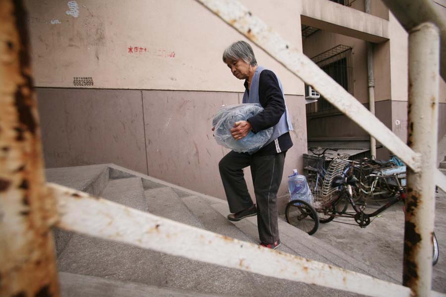 每天早晚都是送水高峰,不论是早上6点还是晚上10点,不论刮风下雨,只要顾客一个电话,老人便会送水上门。长时间的搬运,导致她的背驼得十分严重。老人写信委托本报寻求好心人的救助,帮自己的儿孙治病,渡过难关。王璐 摄/林晖 图片来源:新华网