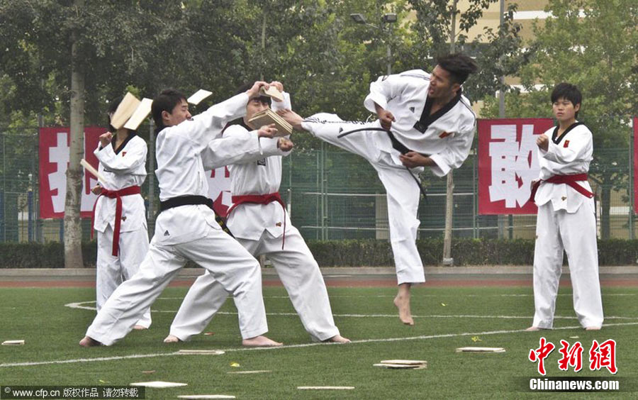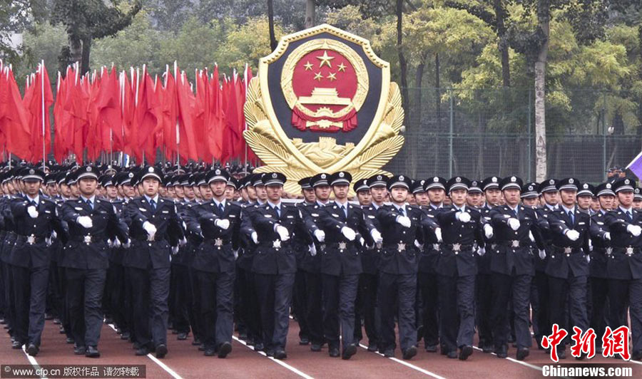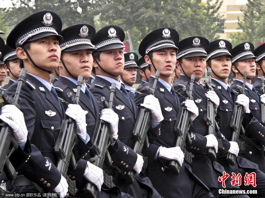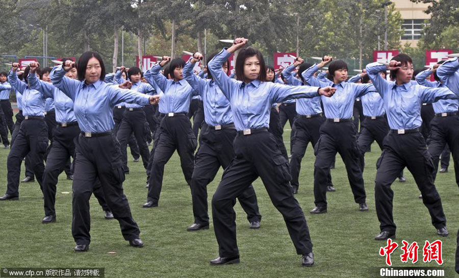 2010年10月20日,中国人民公安大学新生开学仪式在北京大兴校区举行,数百位家长亲临现场,观摩了孩子们在开学典礼上的表演。图为女生们表演匕首制敌的招数。蒲东峰 摄 图片来源:CFP视觉中国