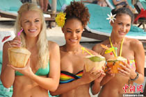 10月22日,海南三亚,第60届世界小姐总决赛当天上午举行运动小姐评比。120余位佳丽在被誉为“天下第一湾”的三亚亚龙湾上演了一场“最美运动会”。经过赛跑、沙滩跳远、游泳三个项目的比拼,20岁的北爱尔兰小姐Lori MOORE (中)获得“运动小姐”桂冠,斯洛伐克小姐Marina GEORGIEVOVA (右)和挪威小姐 Mariann BIRKEDAL(左)分获二三名。 第60届世界小姐总决赛晚会将于10月30日举行。中新社记者 尹海明 摄