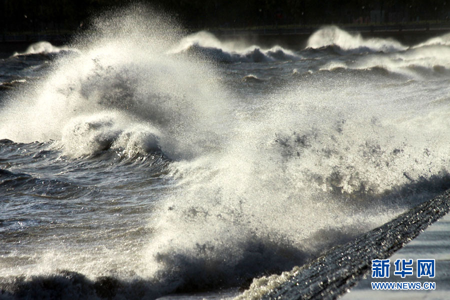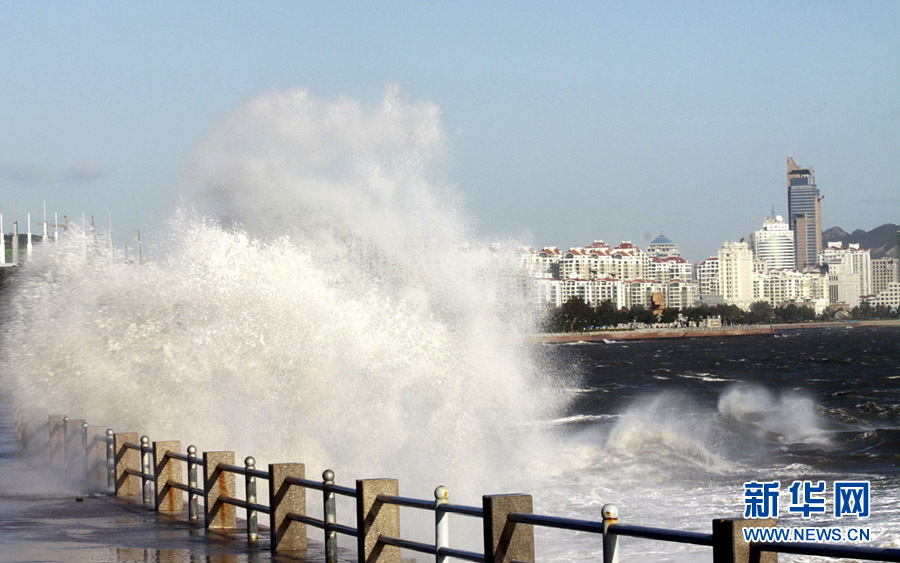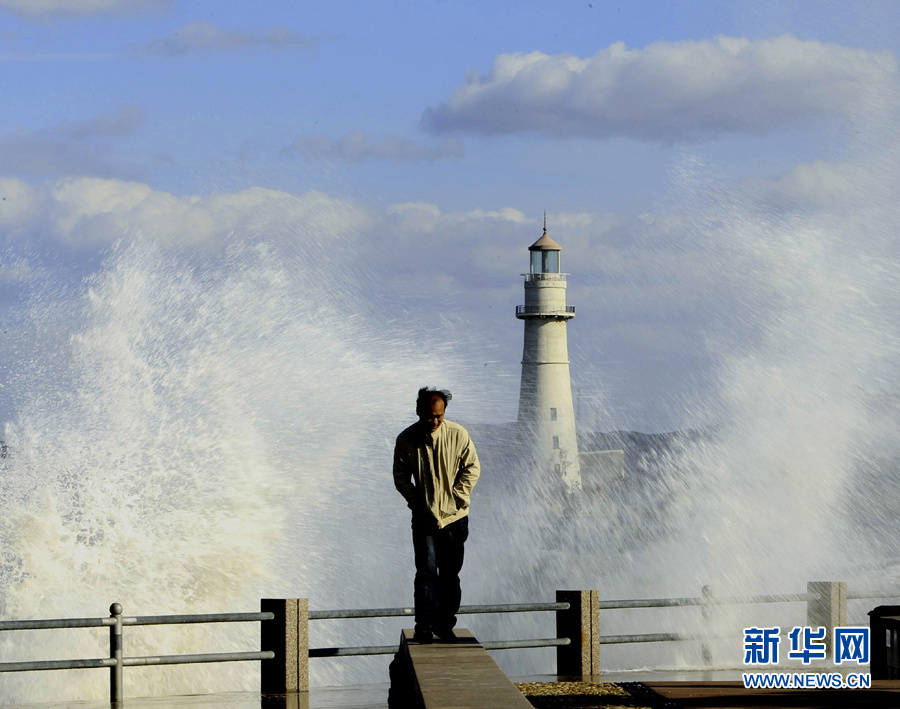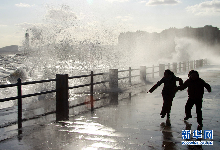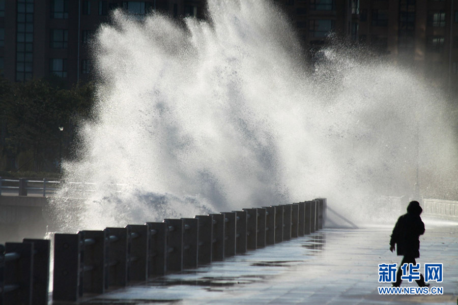 10月25日,一名行人从山东威海海滨掀起的浪花旁走过。当日,受强冷空气影响,山东威海海上风力达8至9级,阵风风力达到11级,海滨大浪排空,威海市海上搜救中心发布海上风险黄色预警。于启波 摄 图片来源:新华网