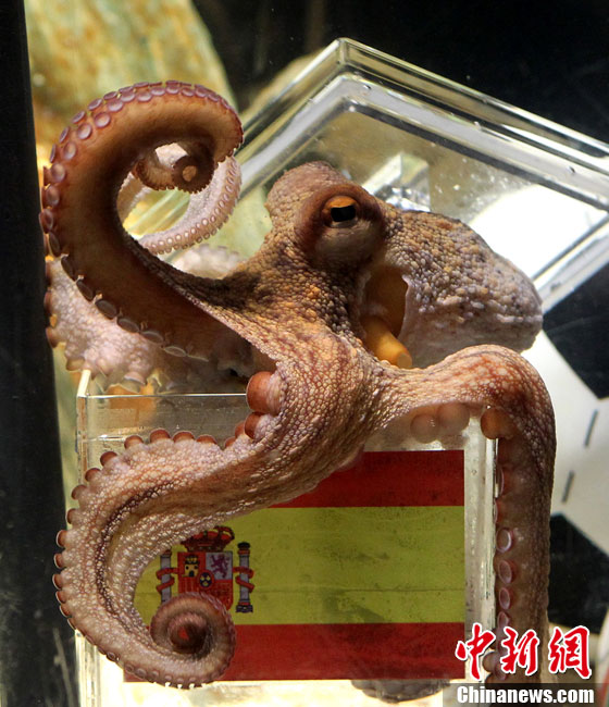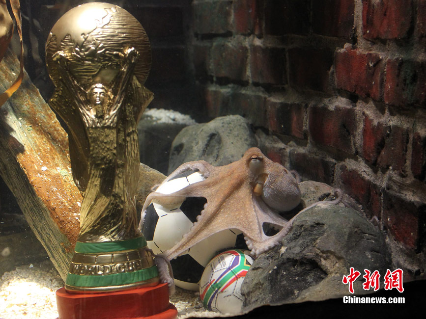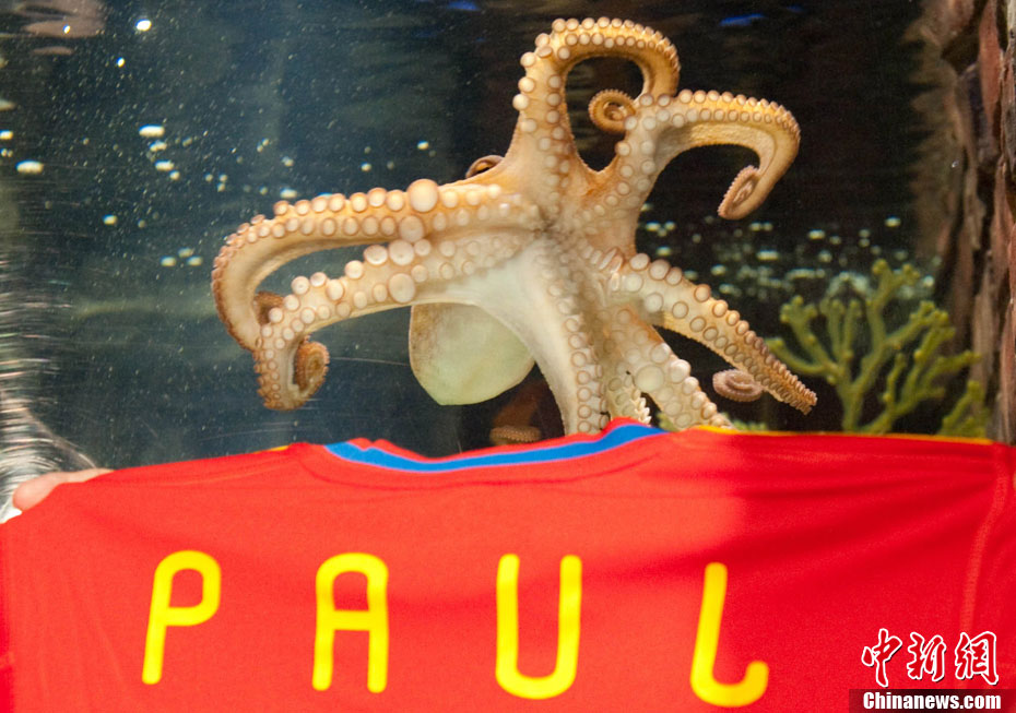 据悉,保罗的尸体目前已被冷藏,水族馆正在商讨“怎样以最好的形式纪念”。图为在世界杯后章鱼保罗获赠一件印有它名字的西班牙队队服。