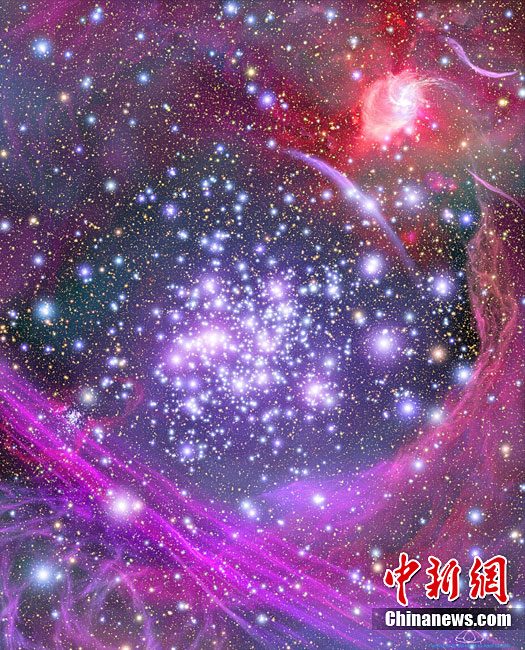 美国宇航局(NASA)近日公布了银河系深处拱门星团的最新艺术效果图。改图根据哈勃太空望远镜和一些地面望远镜拍摄的图像描绘而成。拱门星团存在于银河系中心黑洞附近,包含有大约3万个类似于太阳的恒星,而且该恒星团的密度在银河系所有已知同类天体构造中是最大的。据测算,Arches的直径约为三光年,其内部天体密度超过太阳系约一百万倍。
