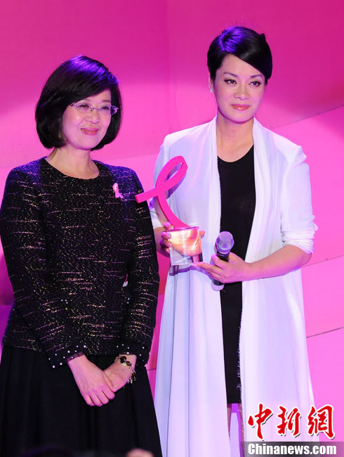 10月26日晚,《时尚健康》粉红丝带盛典在北京盛大举行。历届粉红丝带代言人代表毛阿敏、柯蓝与今年的代言人海清、张雨绮共同登上粉红舞台,江映蓉、爱戴、叶蓓、翁虹、范志博、巩新亮、孟倩、李鑫雨等众星云集。目前,“粉红丝带乳腺癌防治运动” 已成为中国最具影响力的时尚公益活动之一。图为张雨绮、海青与众嘉宾合影。中新社发 李学仕 摄