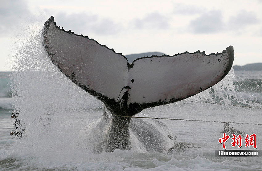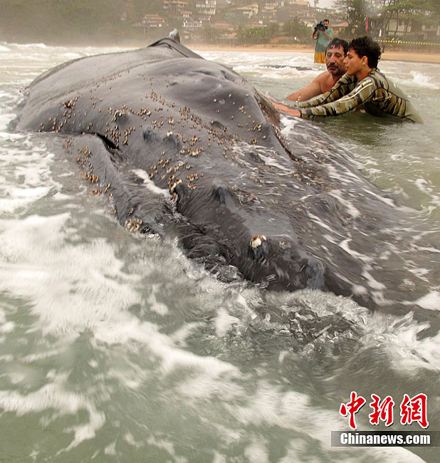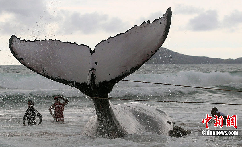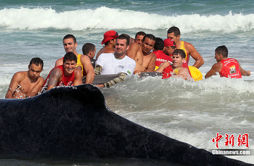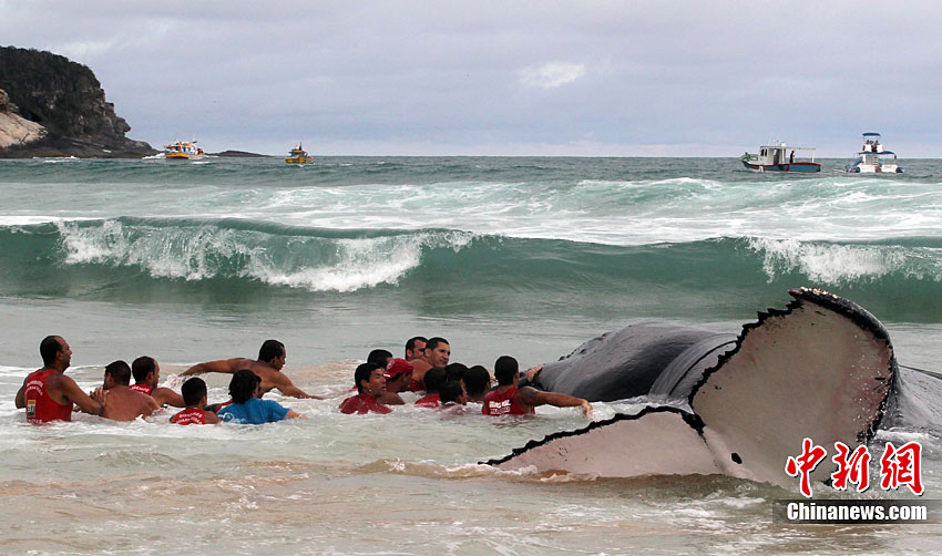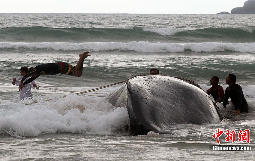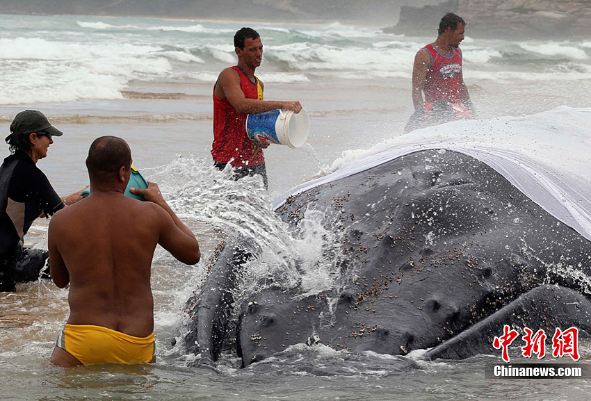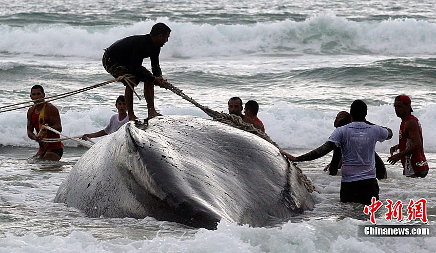 当地时间10月26日,在距离巴西里约热内卢192公里的布济乌斯,救援人员试图挪动搁浅的座头鲸。座头鲸每年7月到11月从南极洲向北迁往巴西海域交配。