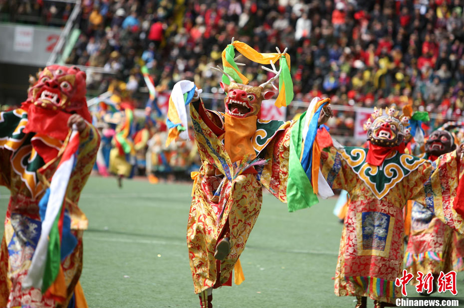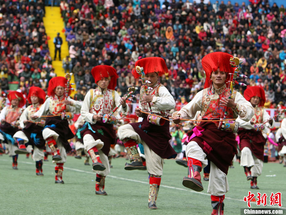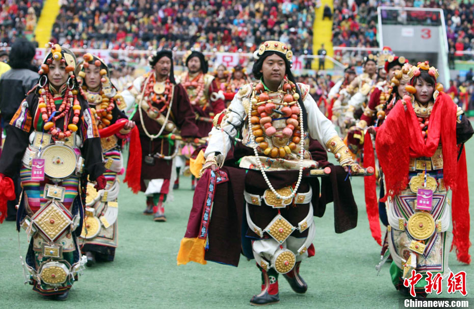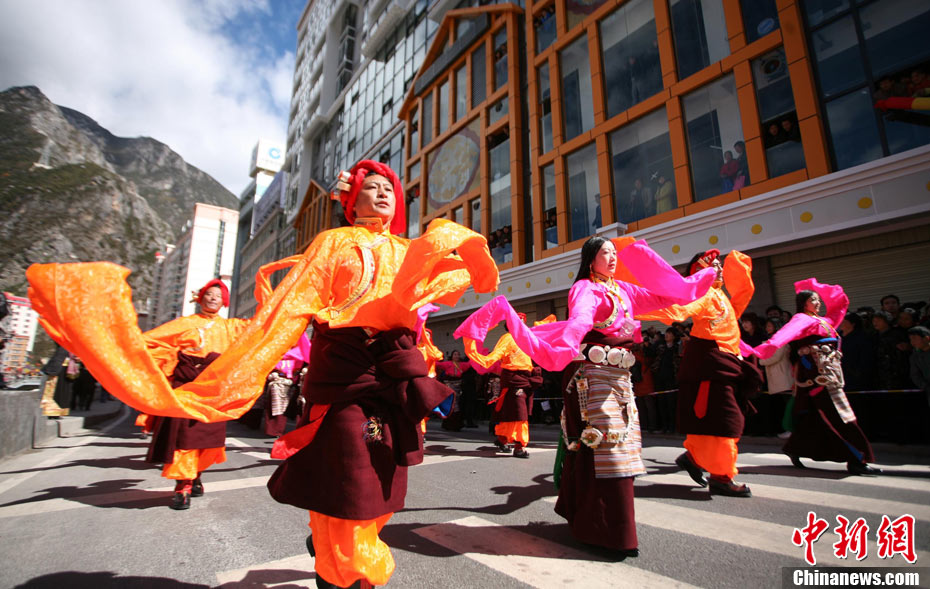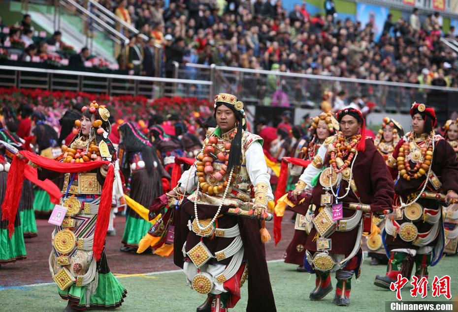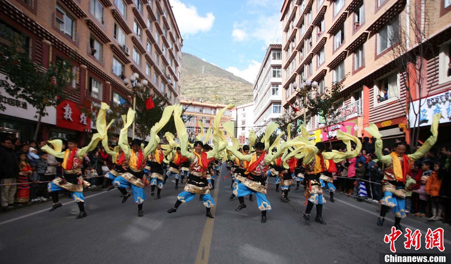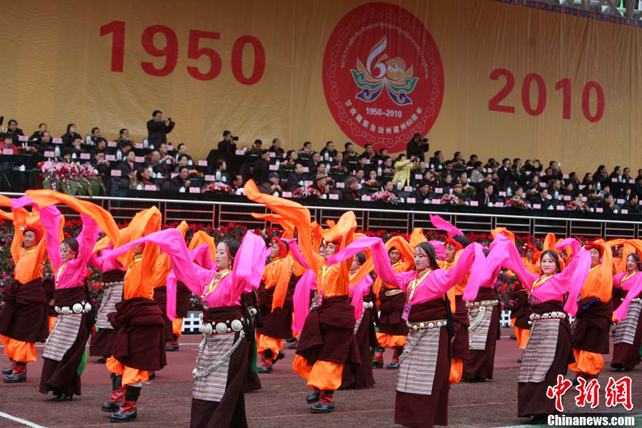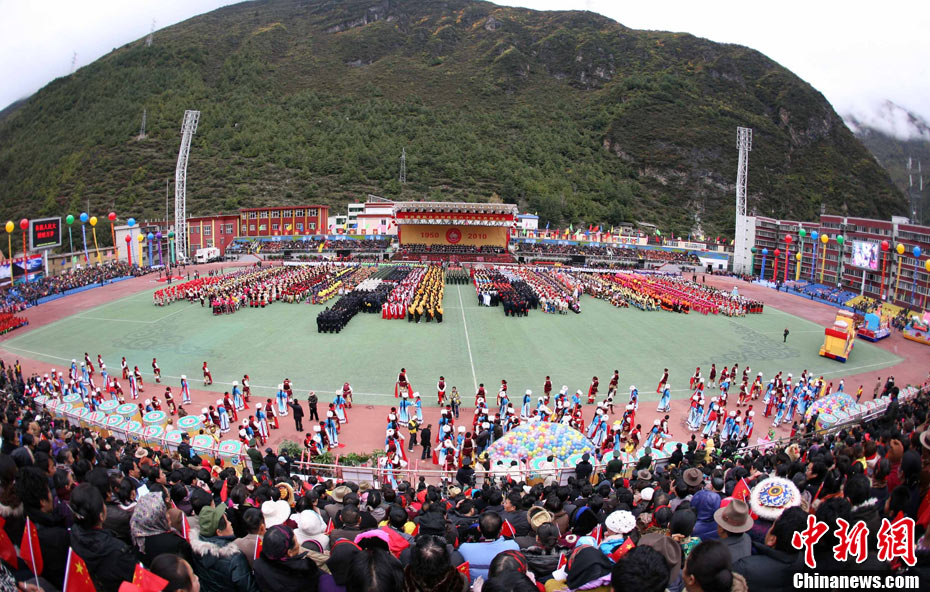 10月27日,四川甘孜藏族自治州举行庆典活动庆祝建州60周年。甘孜藏族自治州成立于1950年11月24日,是新中国成立后建立的第一个专区级少数民族自治州。甘孜位于四川省西部,青藏高原东南缘,地处川、滇、藏、青交界处,辖18个县,325个乡(镇),总人口102万,藏族人口占80%以上。图为庆典现场。中新社发 刘忠俊 摄
