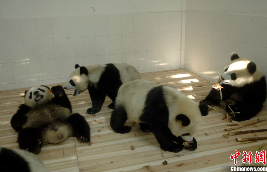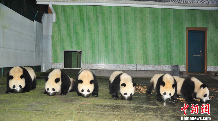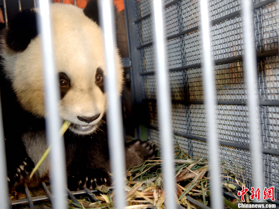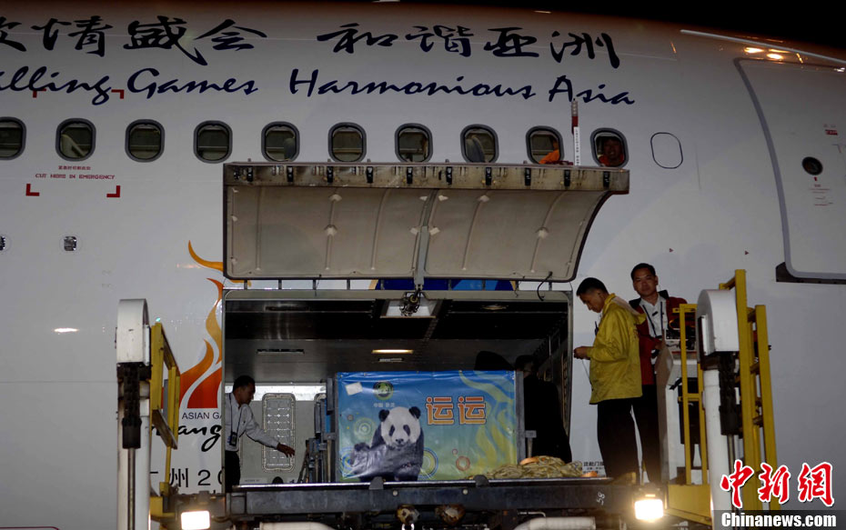 10月27日晚,6只出生于四川卧龙保护大熊猫研究中心的大熊猫乘“亚运号”专机抵达广州,落户香江野生动物世界,与动物园现有6只大熊猫共同组成“亚运熊猫团”,为下月在广州举行的第16届亚运会助威。中新社发 刘卫勇 摄