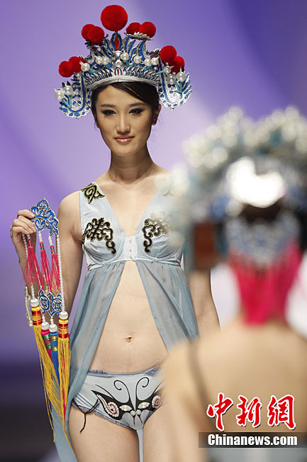 10月28日, 2010“欧迪芬杯”中国内衣设计大赛在北京举行,20位冲过初赛、复赛层层挑战的选手们,聚集在中国内衣设计的最高赛场,用创意与灵感展开激烈角逐。图为模特展示欧迪芬“中国红”内衣系列。中新社记者 盛佳鹏 摄