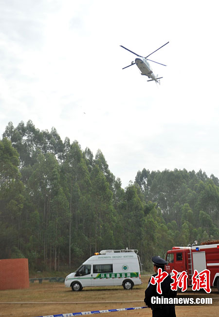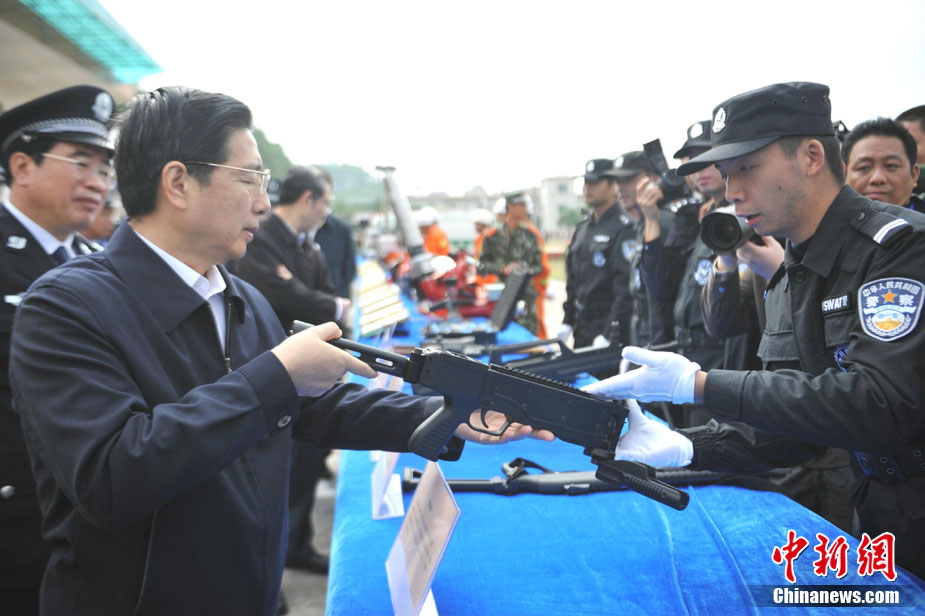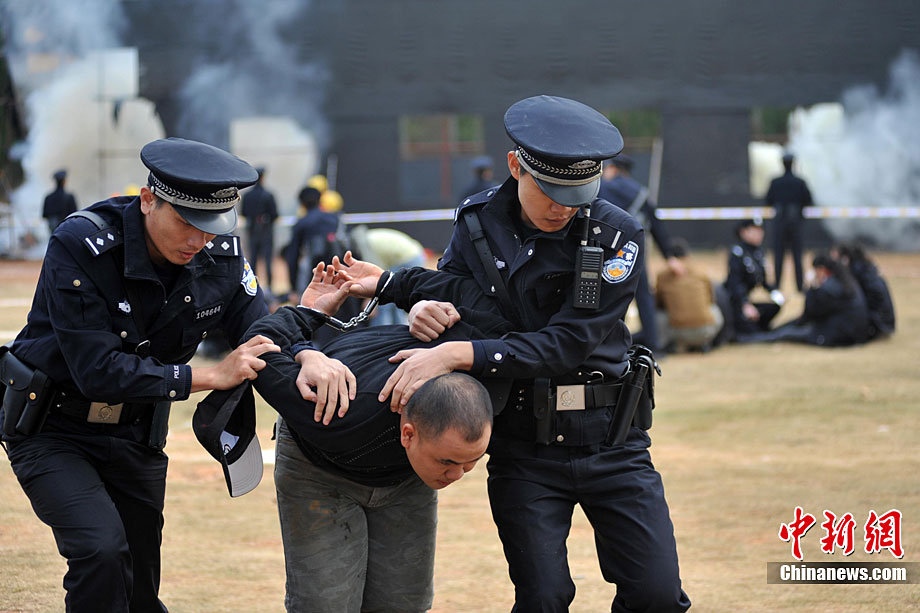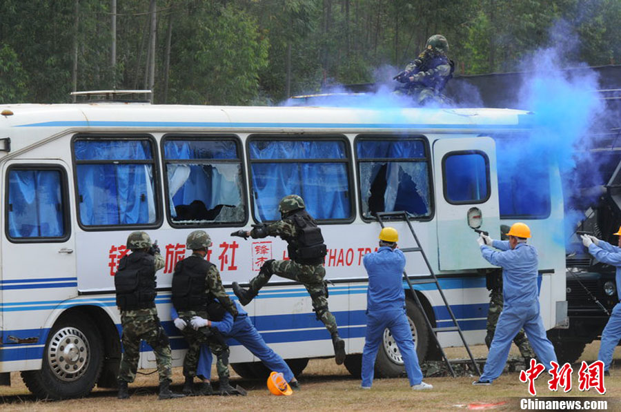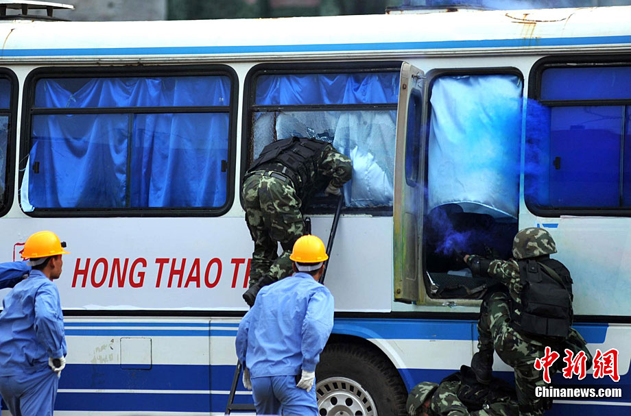 10月28日,广西举行亚运安保反恐演练。在演习中,警方采用了多种先进反劫持设备,模拟各种突发状况。图为演练被劫持大巴人质解救过程。广西共有八条通道通往广东,是环粤亚运安保的重点地区之一。中新社记者 蒋雪林 摄