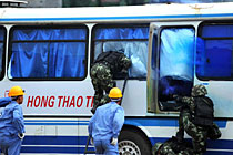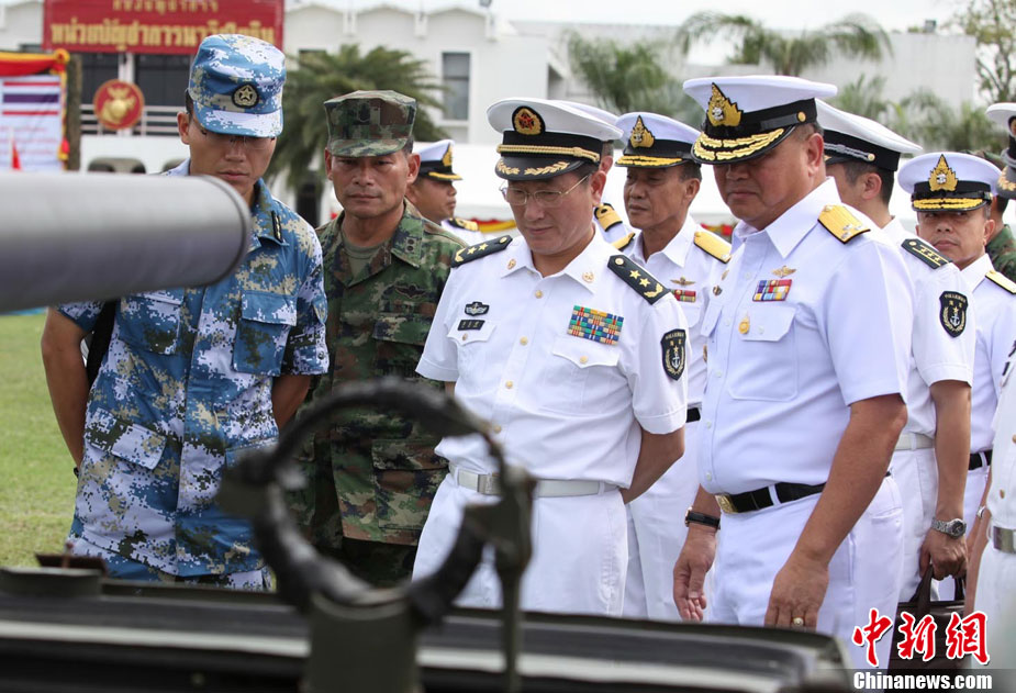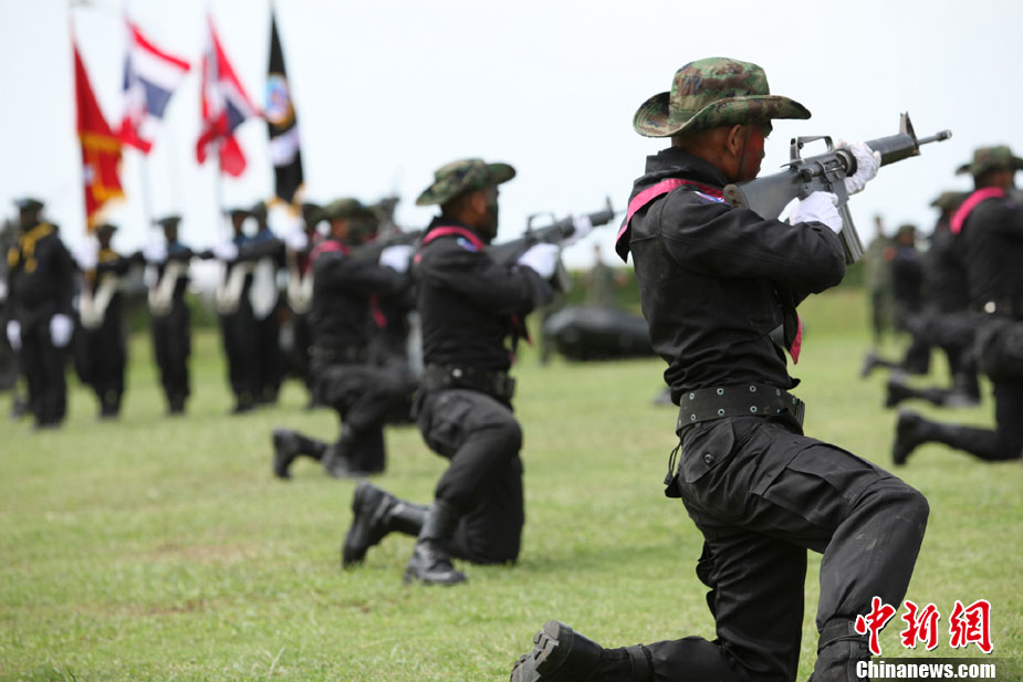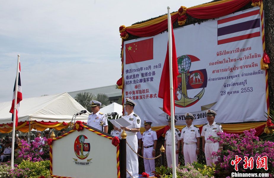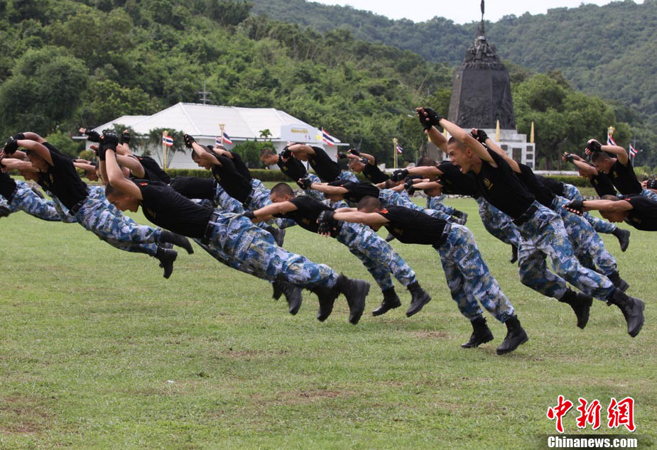 10月28日,代号为“蓝色突击—2010”的中、泰海军陆战队联合训练在泰国梭桃邑海军基地拉开帷幕。图为中国海军陆战队参训官兵在开训仪式进行技能演示。中新社记者 余显伦 摄