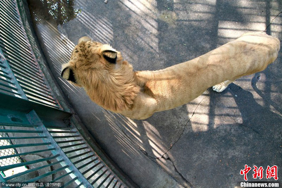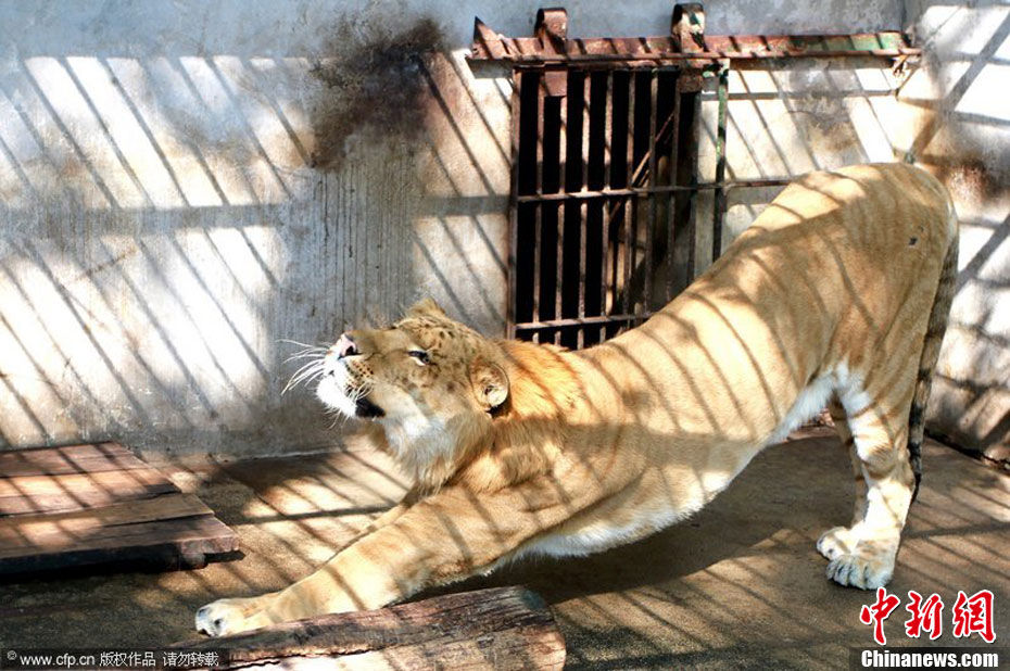 2010年10月27日,江西九江甘棠公园动物园工作人员正隔着铁栏杆在给一只虎头狮身的“怪物”挠痒。这只“怪物”名叫狮虎兽,是是雄性狮子和雌性老虎交配产生的后代。此只狮虎兽引进自安徽安庆,目前已三岁,这是狮虎兽首次亮相江西,有关资料显示,狮虎兽的成活率只有50万分之一,目前世界上存活的狮虎兽只有20只左右,所以被形容为比熊猫还珍贵的动物。 图片来源:CFP视觉中国