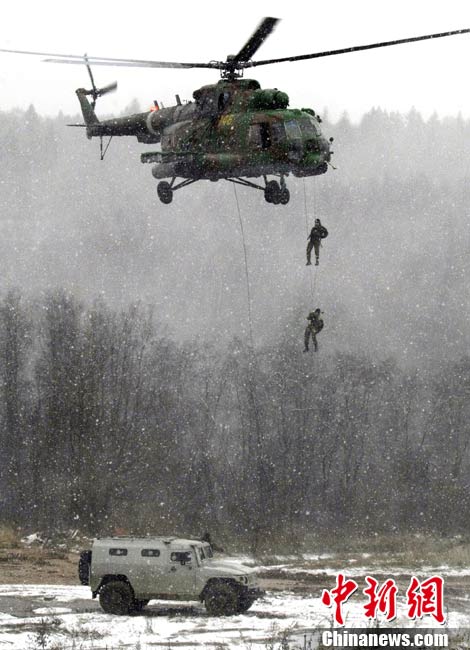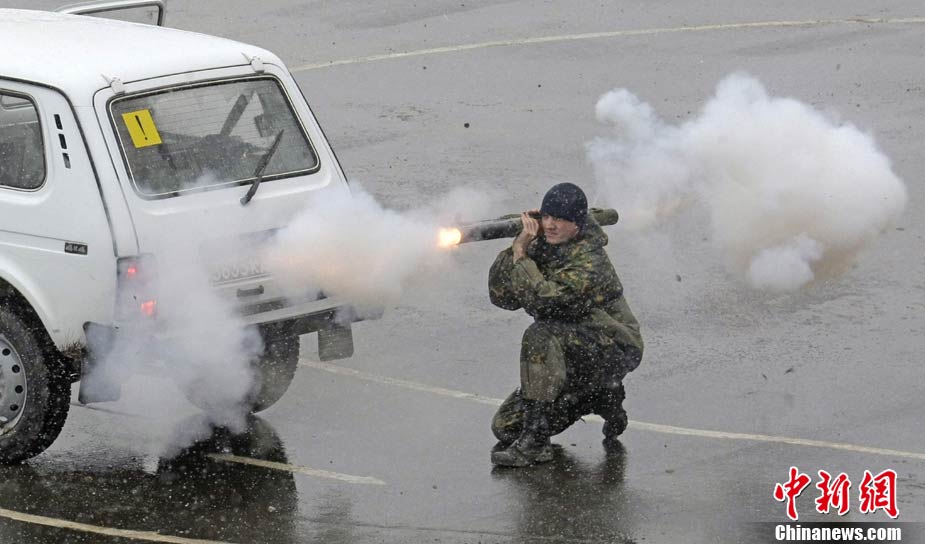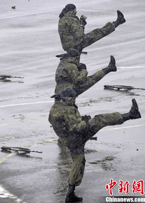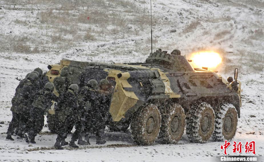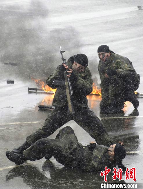 俄罗斯特警冒雪进行战术示范演练