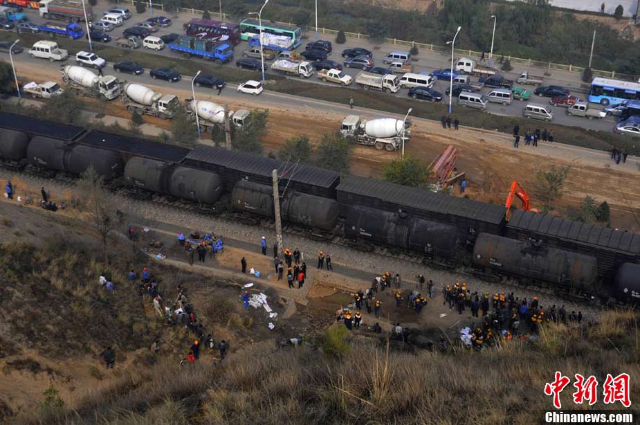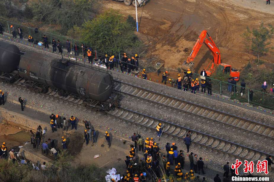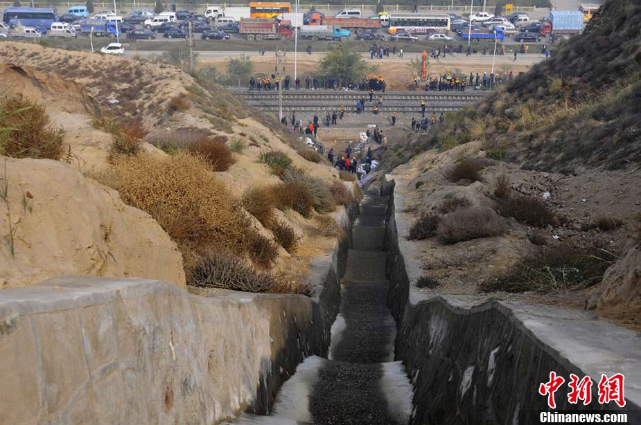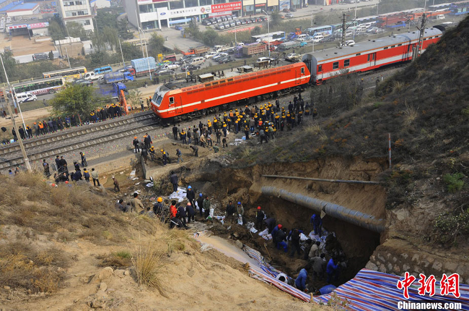 10月30日早晨,兰新铁路线遭水害遇险情,兰新线K8+500米处南侧山上,有废水从山体冲下,将兰新线上下行路基冲穿,严重危及行车安全。根据铁路部门的测量,上行路基一侧被冲塌形成了50立方米的坑,下行路基一侧冲塌形成的坑有24立方米。兰州铁路局等组织7台大型机械,共有700多人投入抢险。经全力奋战,11时整,兰新线下行线路开通;11时15分,兰新线上行线路开通。杨艳敏 摄