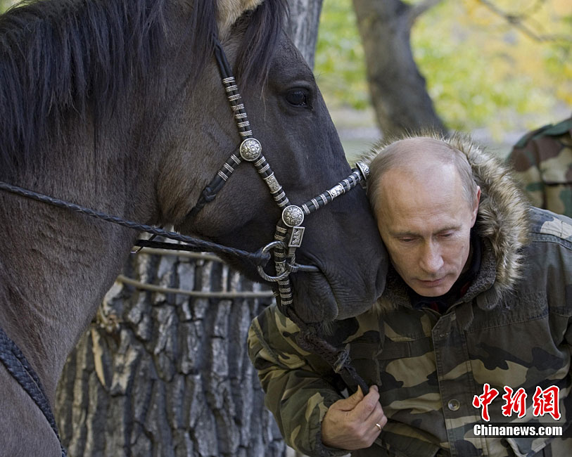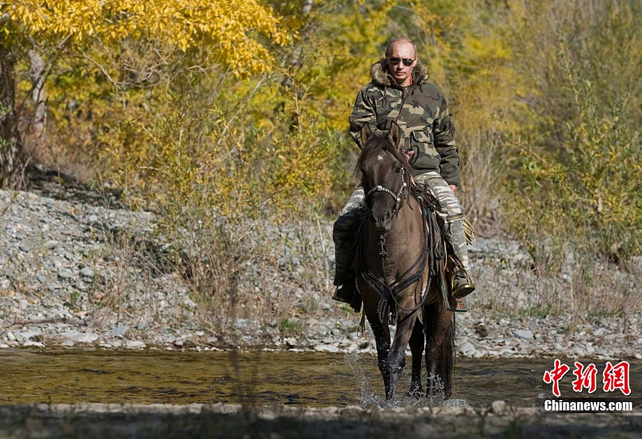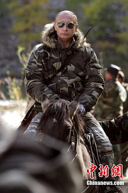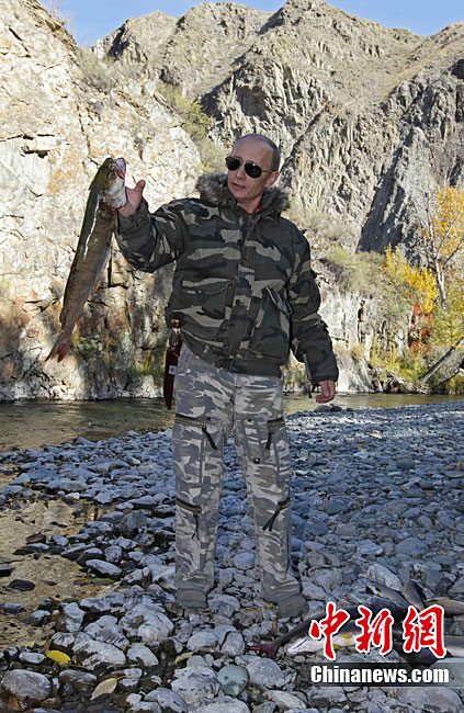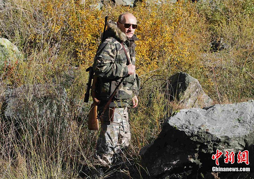 俄总理普京着迷彩服背猎枪深入雪豹栖息地