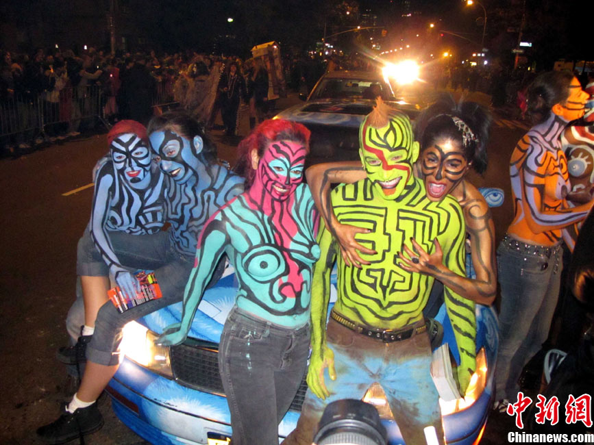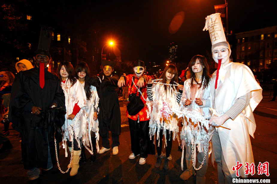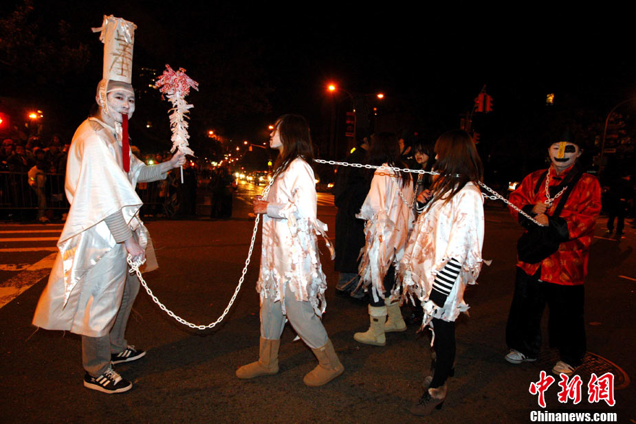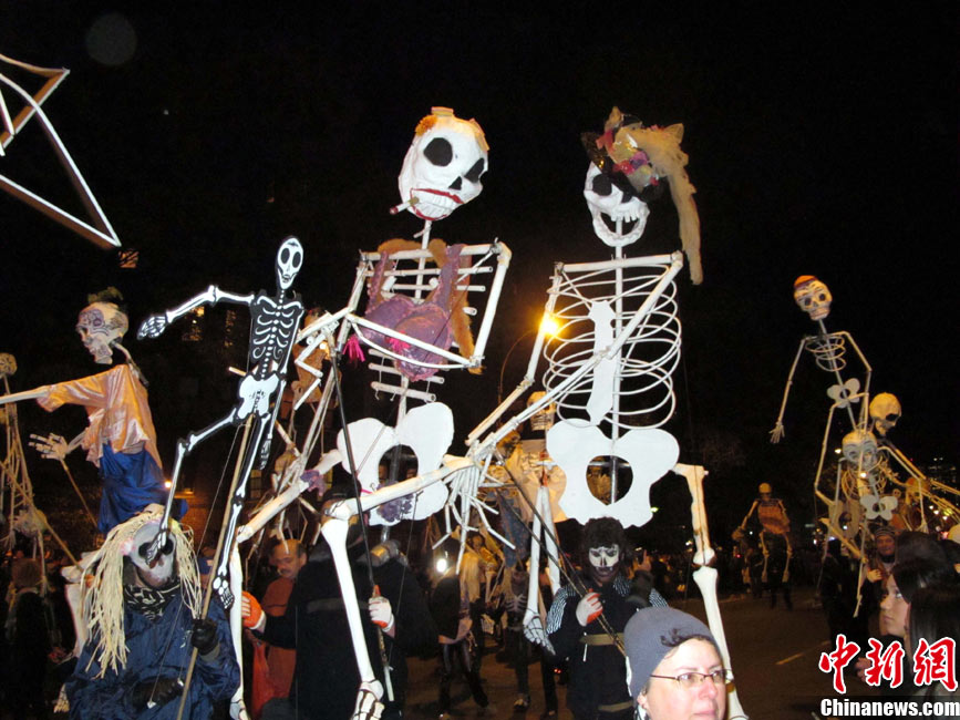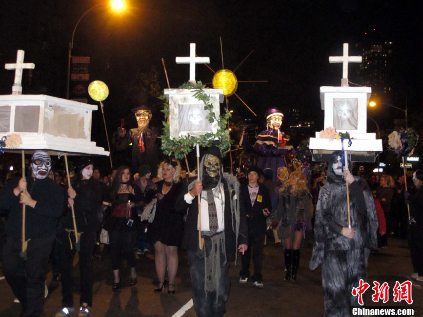 当地时间10月31日晚,一年一度的纽约万圣节前夜狂欢大游行在纽约第六大道举行,这是全世界最大的万圣节游行。中新社记者 孙宇挺 摄