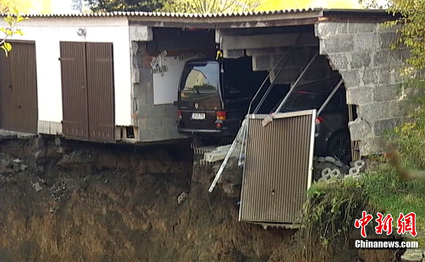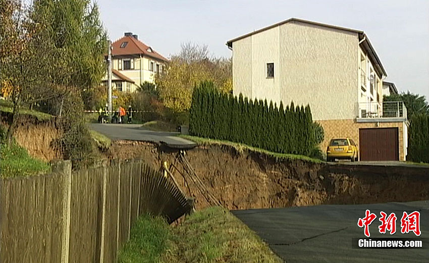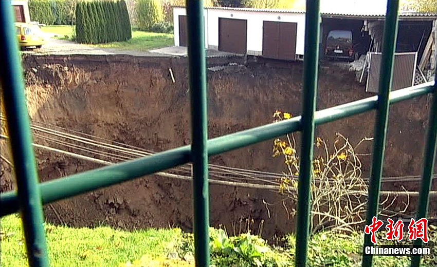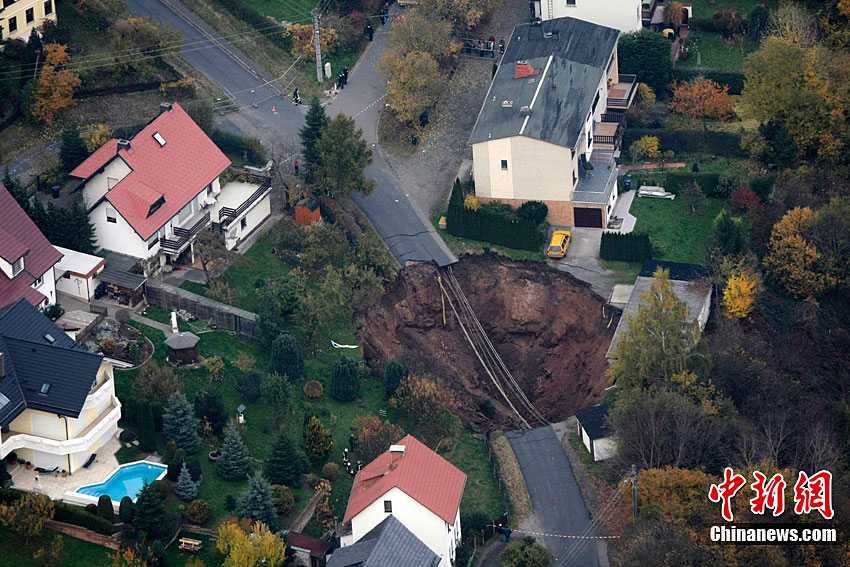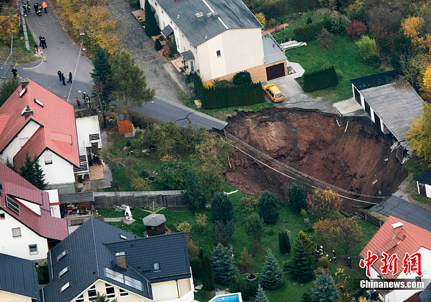 11月1日,在德国东部城镇施马尔卡尔登,车辆停在地面塌陷出现的坑洞旁。施马尔卡尔登地区当日出现地面塌陷情况,部分居民撤离了发生事故的地区,目前无人因地面塌陷事故受伤。