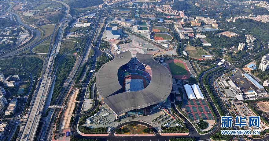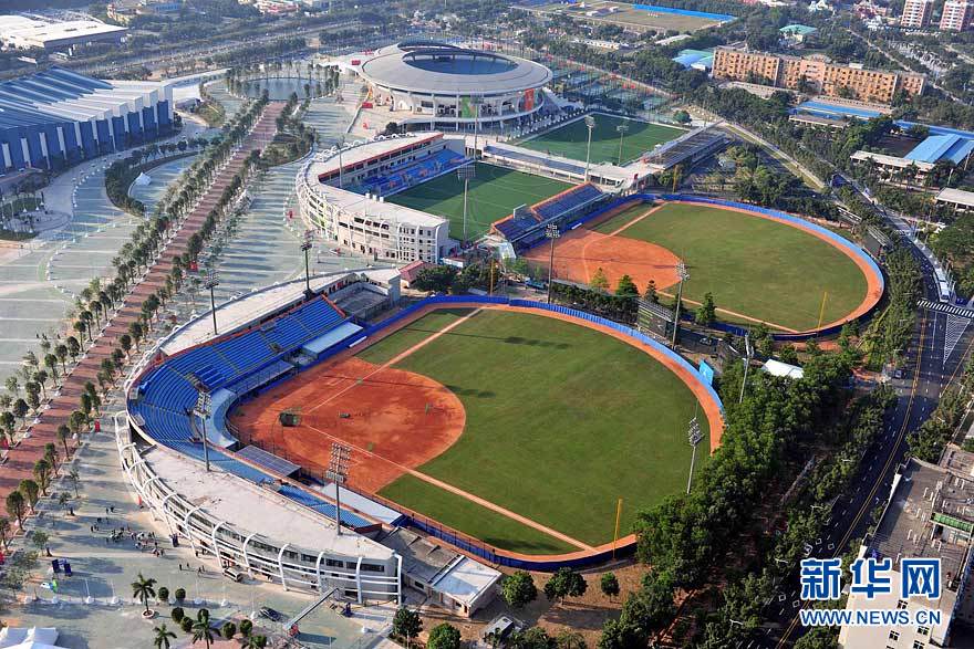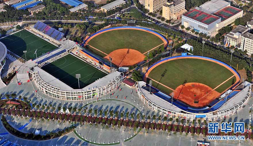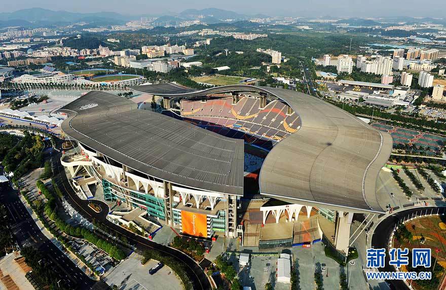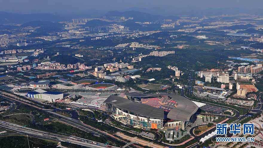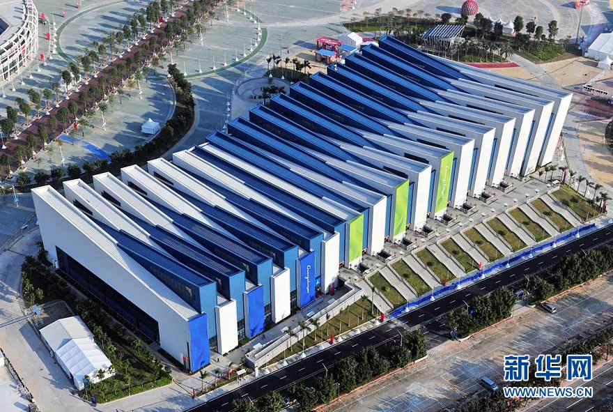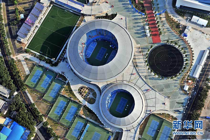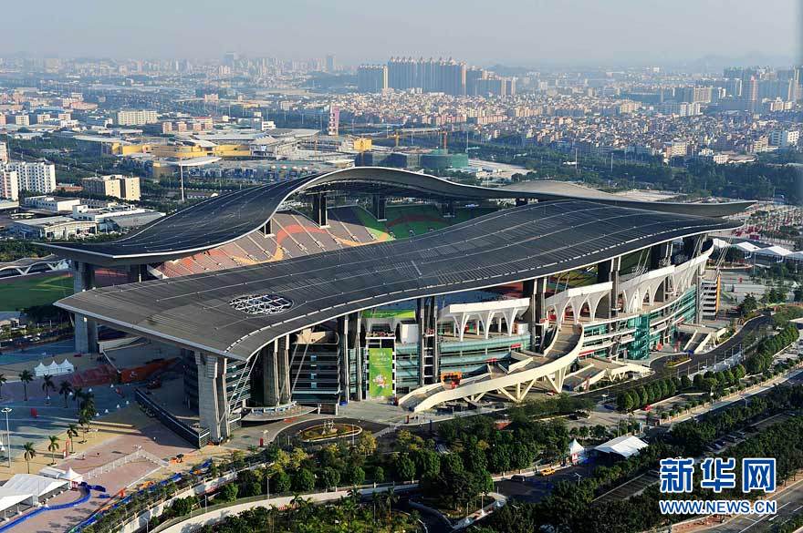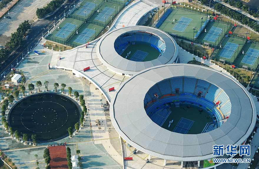 图为航拍的广东奥体游泳馆(摄于10月29日)。在广州亚运会期间,广东奥林匹克体育中心场馆群将举行田径、游泳、射击、网球、棒球等项目的比赛。刘大伟 摄 图片来源:新华网