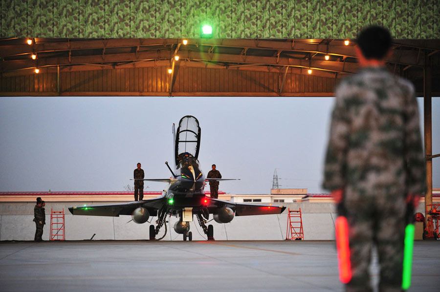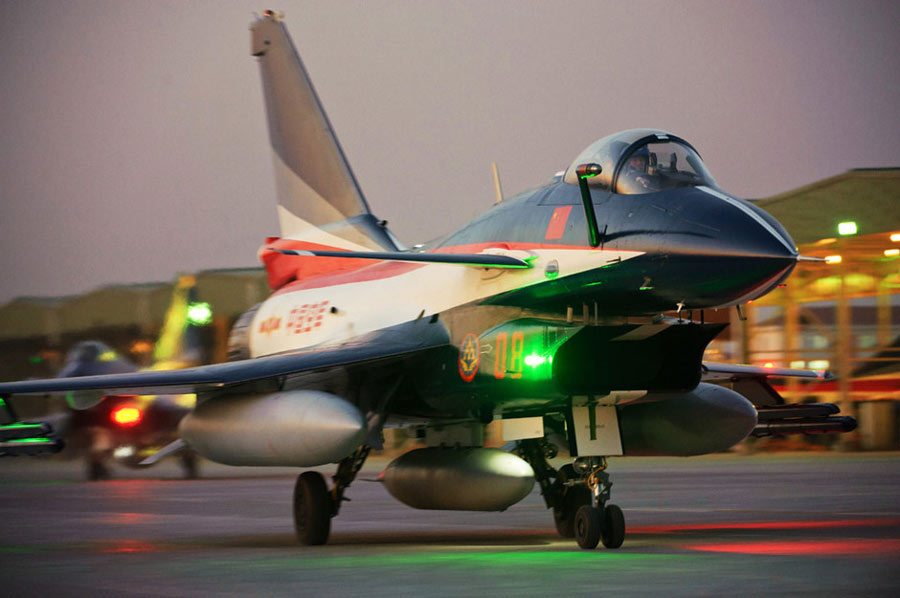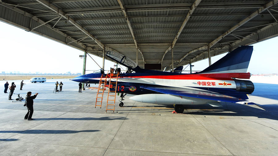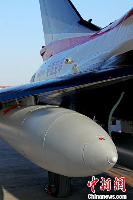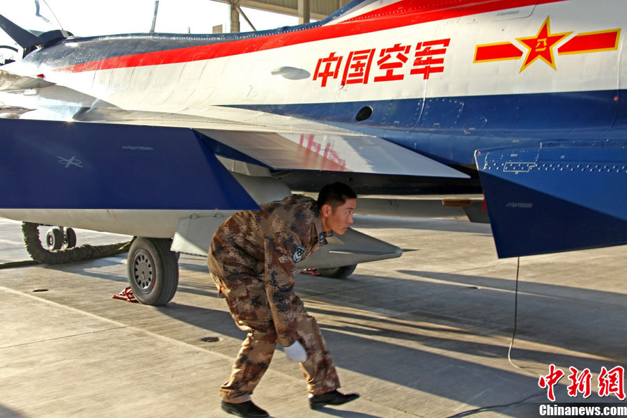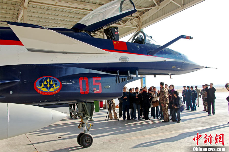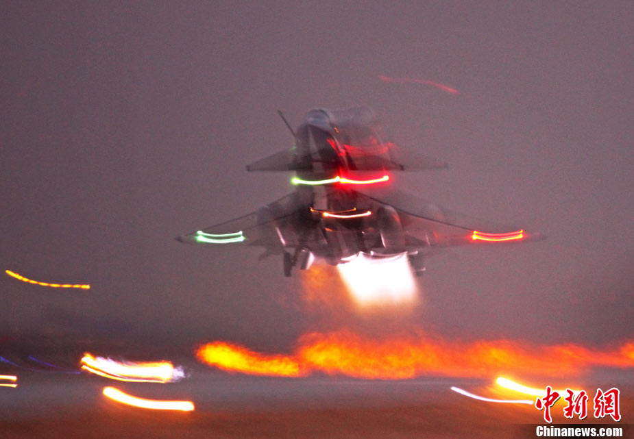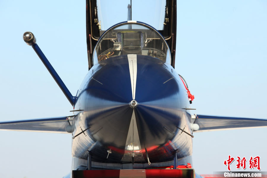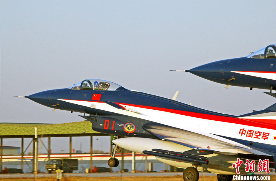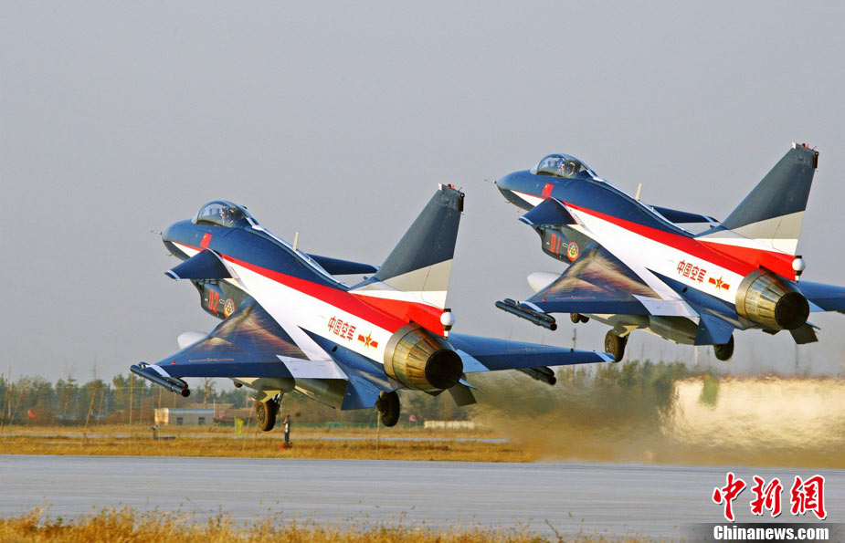 11月初,中国空军八一飞行表演队新涂装的歼10飞机双机起飞。空军八一飞行表演队7架歼—10战机近日将飞赴珠海,参加11月16日至21日举行的第8届中国国际航空航天博览会(珠海航展)。这是表演队换装歼—10战机后,首次以新涂装向世人正式亮相。空军还将派出歼—8F、歼轰—7A、轰—6H、空警—200、直—8KA、直—9WA等7型飞机,参加这次国际性综合航展。中新社发 谭超 摄