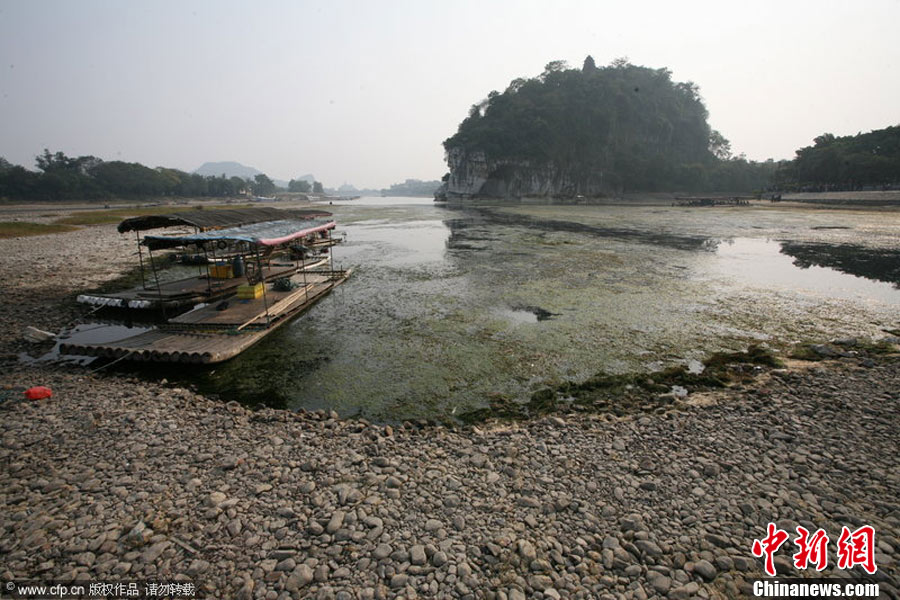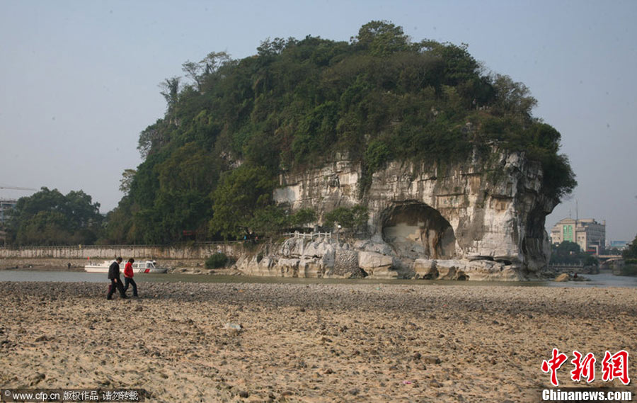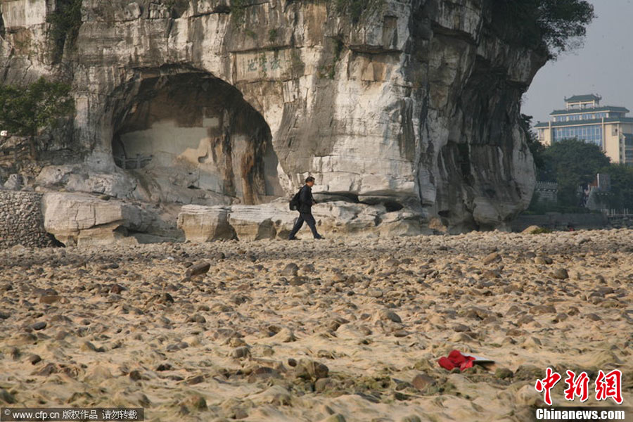2010年11月4日,广西桂林,象鼻山前干涸的河床。入秋以来,桂林持续干旱,漓江水位下降,进入秋冬枯水期。李凯 摄 图片来源:CFP视觉中国