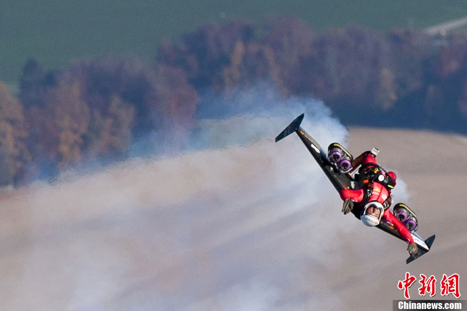 当地时间2010年11月5日,瑞士贝尔谢“火箭人”伊夫-罗西使用装有小型喷气发动机的喷气动力翼,首次完成空中翻转特技。