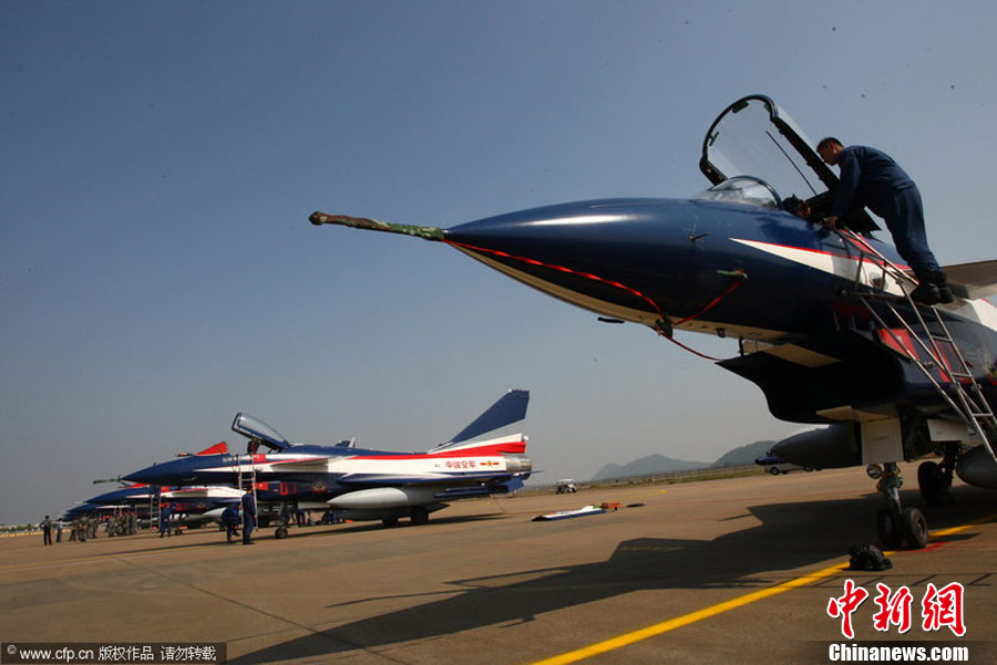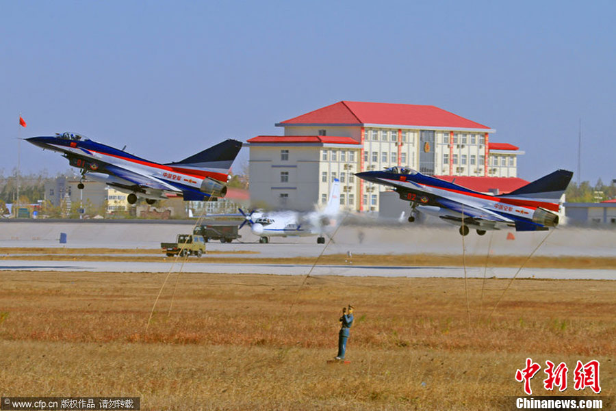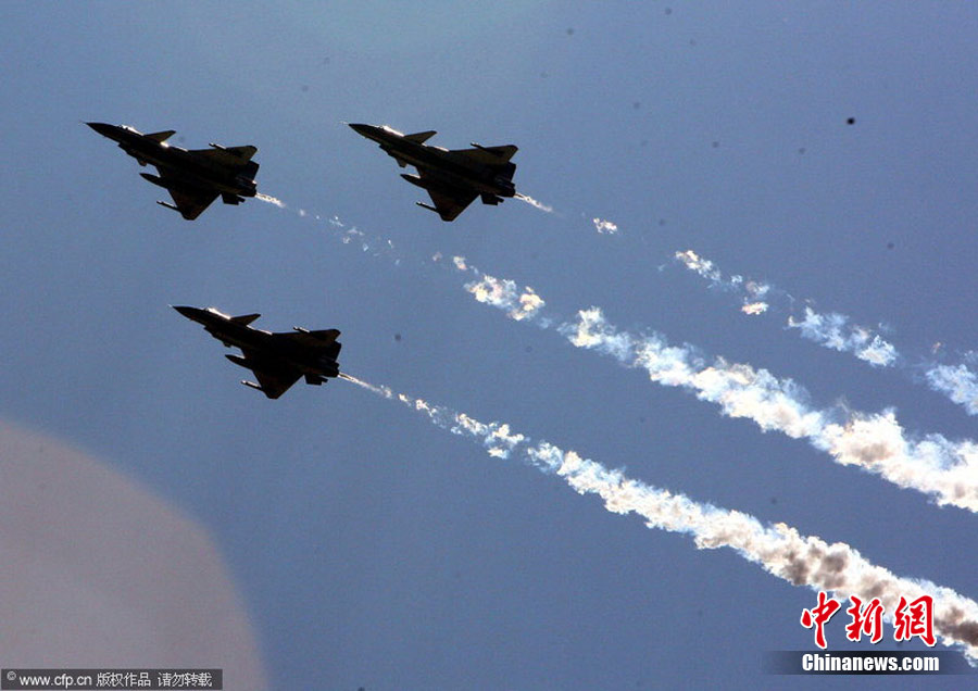 2010年11月8日,中国空军“八一”飞行表演队的7架歼十表演机从华北某机场起飞,经过约2个半小时的飞行,飞抵珠海三灶机场。将在珠海航展上进行一系列的精彩特技表演。林森 摄 图片来源:CFP视觉中国