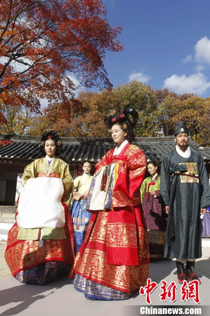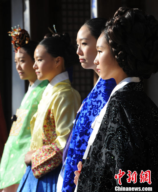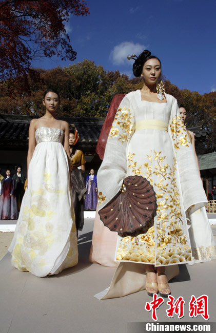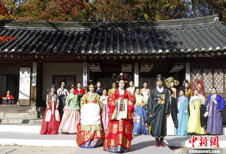 11月9日,韩国首尔昌德宫,模特进行韩服服装秀的排练。本次服装秀是G20峰会期间的活动之一。