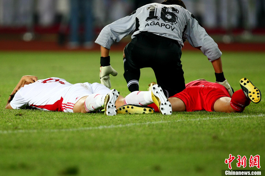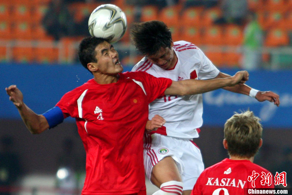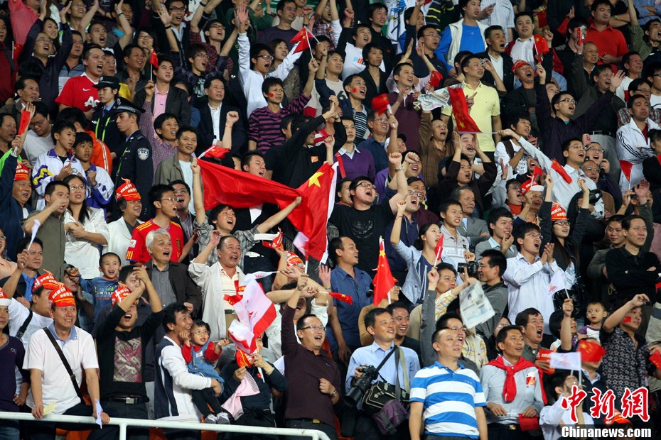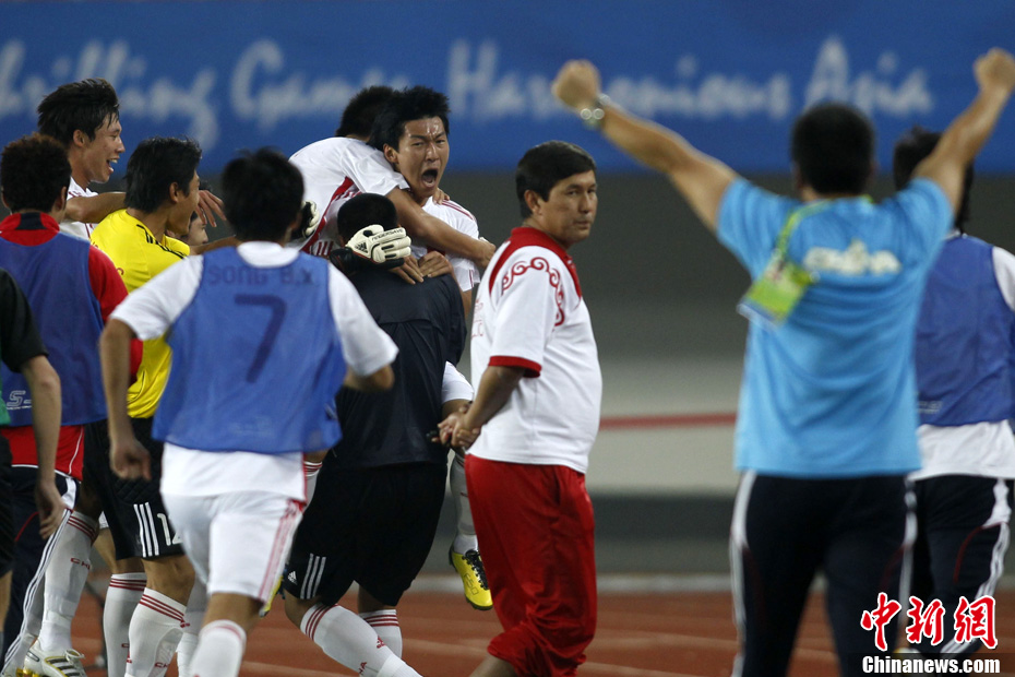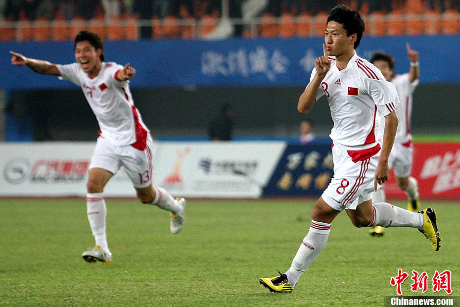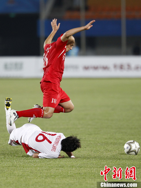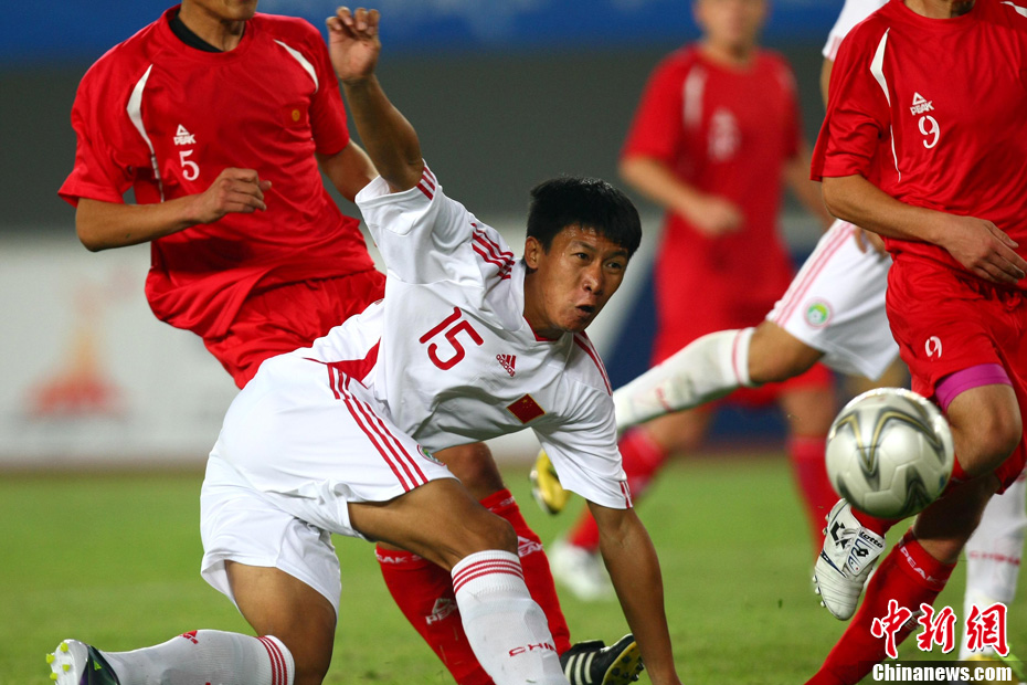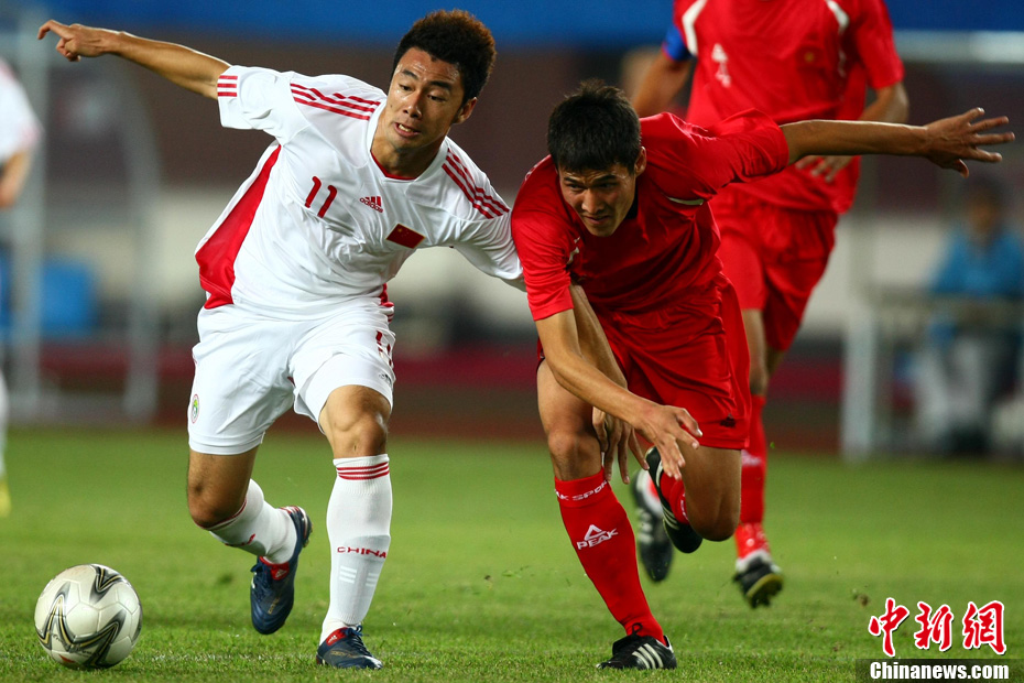 11月10日晚,广州亚运会男子足球小组赛A组第19场中国与吉尔吉斯斯坦的比赛在广州天河体育场进行,最终中国队2:1战胜吉尔吉斯斯坦队。中新社记者 富田 摄