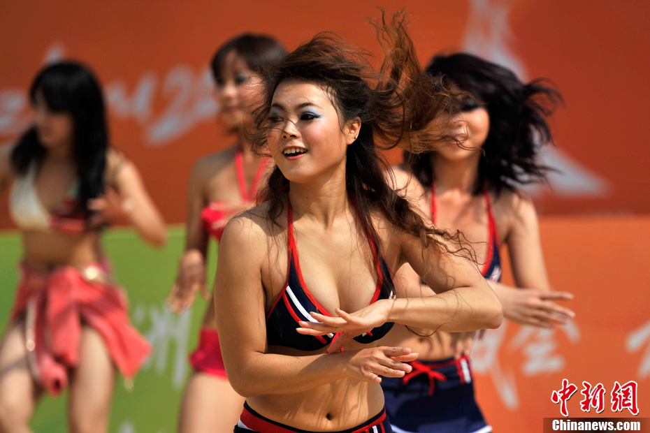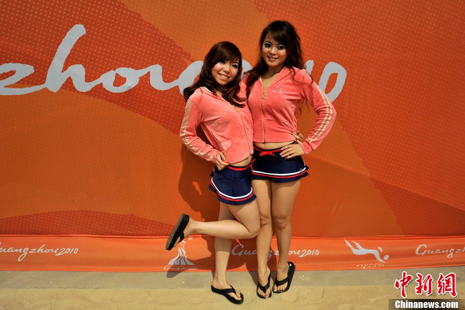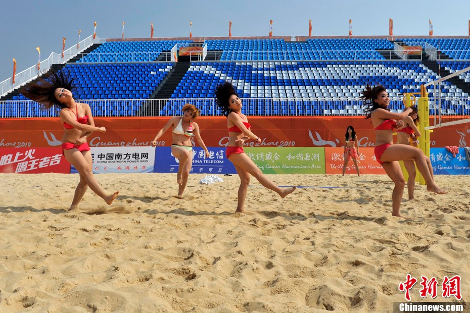 11月11日,热情洋溢的“沙滩宝贝”身着比基尼在广州亚运会沙滩排球馆主赛场进行训练。比赛期间,沙滩排球场将有4支啦啦队进行现场表演。中新社记者 金硕 摄
