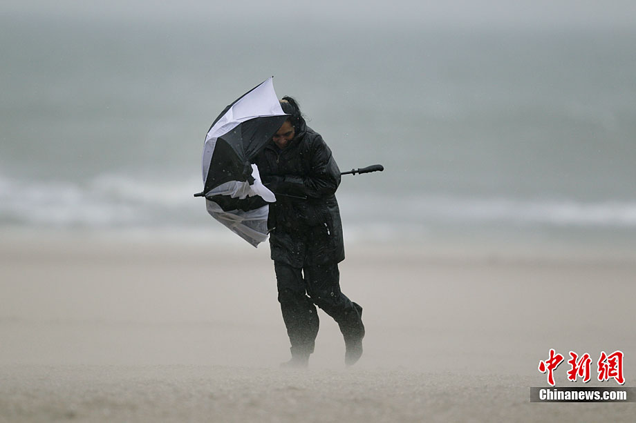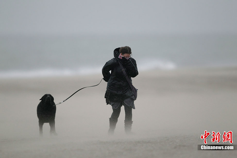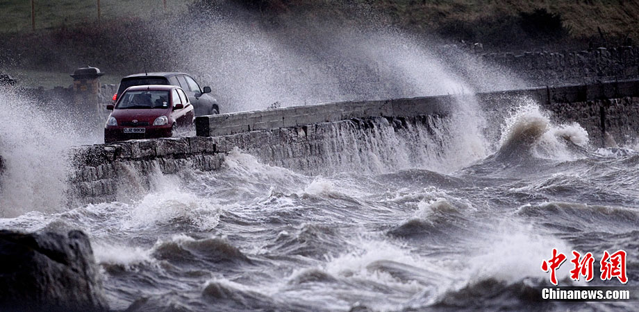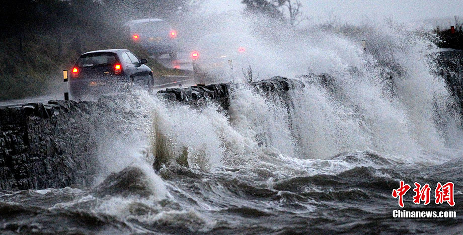 当地时间11月11日,英国和荷兰沿海地区遭遇狂风暴雨天气的袭击。图为北爱尔兰沿海地区遭遇狂风暴雨袭击。