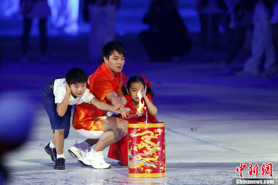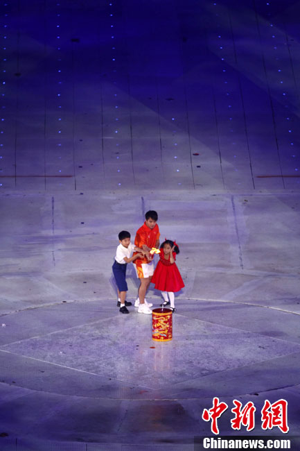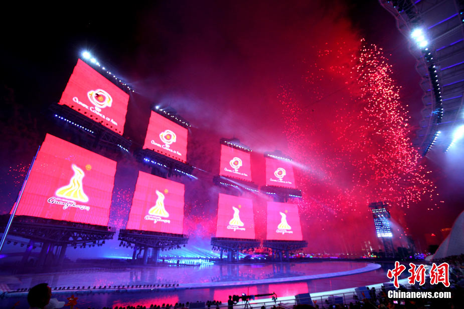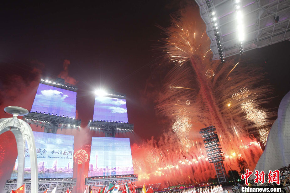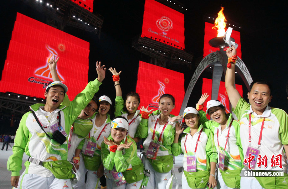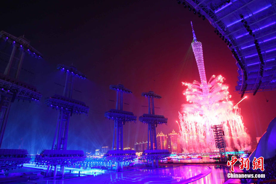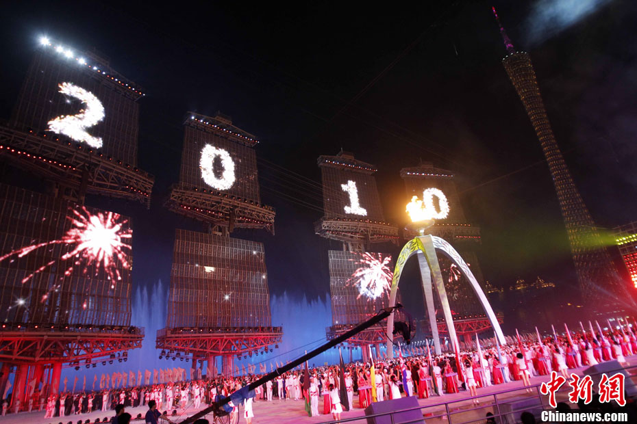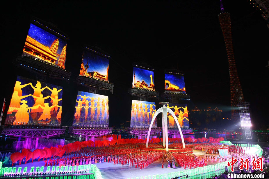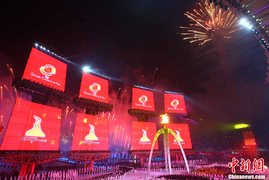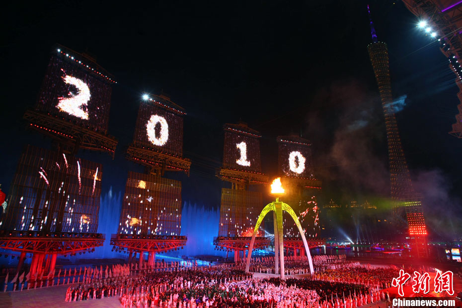 11月12日晚,广州亚运会开幕。图为亚运圣火主火炬点燃。中新社记者 富田 摄