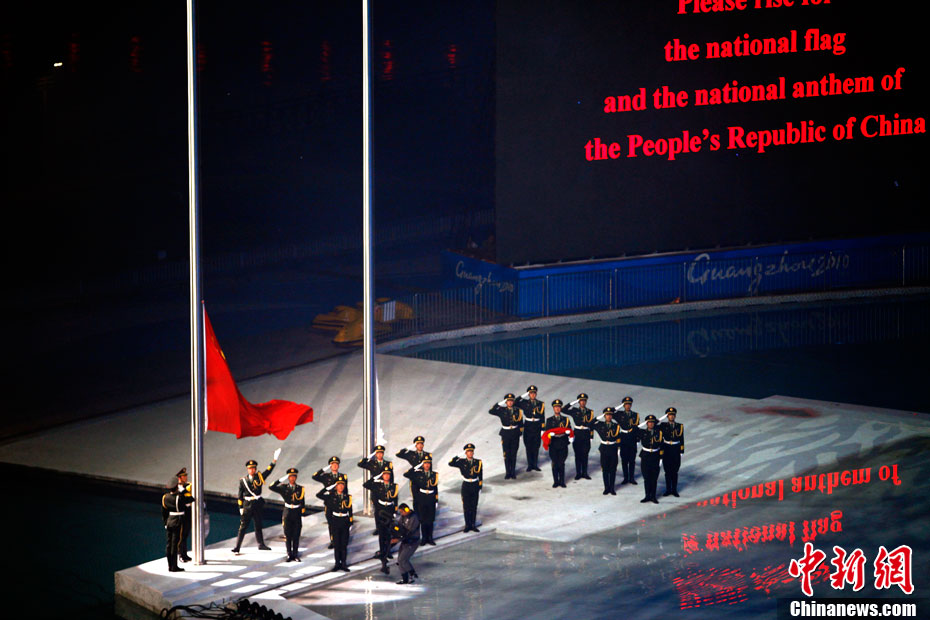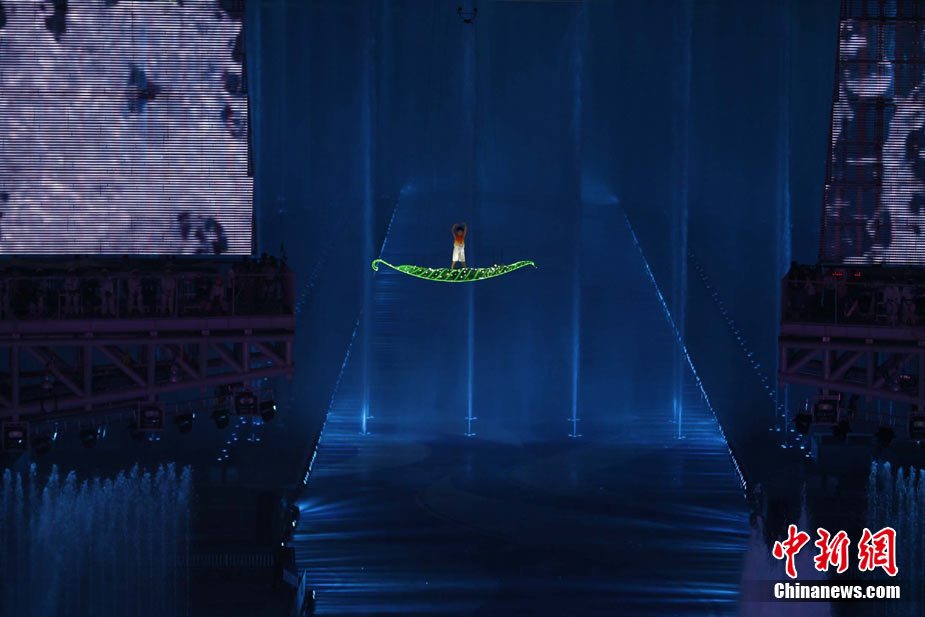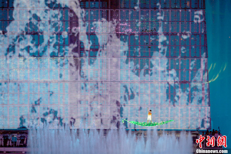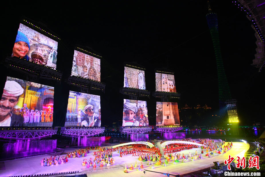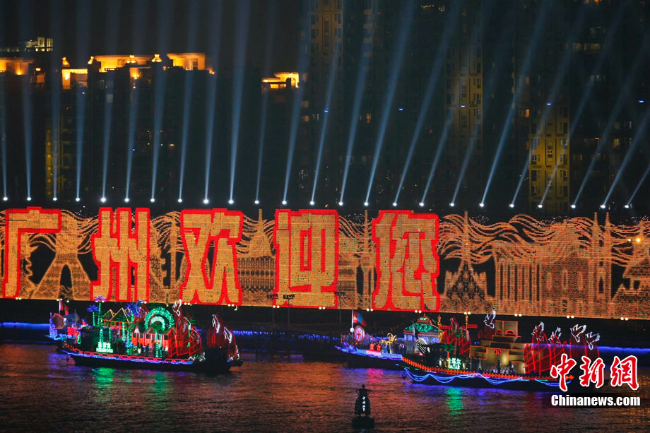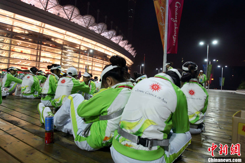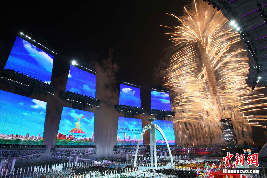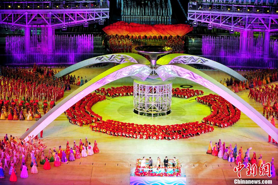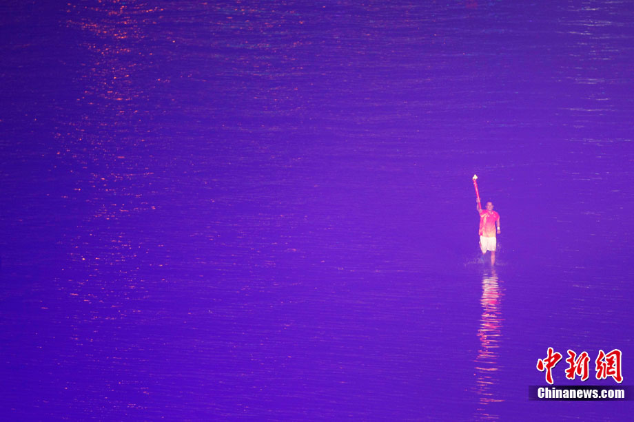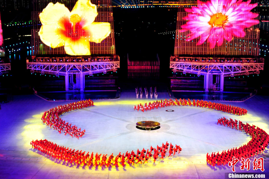 11月12日晚,广州亚运会开幕。图为亚运圣火主火炬点燃。中新社记者 富田 摄